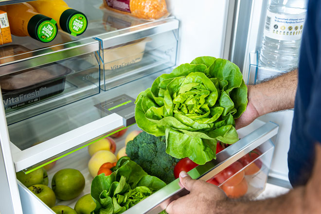 Ο δικός μου σύμμαχος στην κουζίνα, ο ελεύθερος ψυγειοκαταψύκτης της Bosch με 70 εκατοστά πλάτος, έχει συρτάρια με τεχνολογία VitaFresh. Τι σημαίνει αυτό; Ότι με τη χρήση της τεχνολογίας, γίνεται έλεγχος υγρασίας με αποτέλεσμα τα τρόφιμα να διατηρούνται φρέσκα και πλούσια σε βιταμίνες για έως και τριπλάσιο χρονικό διάστημα. Πιο συγκεκριμένα, τα εξειδικευμένα συρτάρια με τεχνολογία VitaFresh 0°C και δυνατότητα ελέγχου της θερμοκρασίας διατηρούν φρέσκα και σε ξεχωριστές αεροστεγείς θέσεις το κρέας ή τα πουλερικά και τα ψάρια, για να μην μεταφέρονται οσμές στον υπόλοιπο χώρο της συντήρησης αλλά και για έως και διπλάσιο χρονικό διάστημα φρέσκα σαν τη στιγμή που τα αγοράσατε. Ενώ τα συρτάρια VitaFresh pro με δυνατότητα ελέγχου της υγρασίας και της θερμοκρασίας συνδυάζουν όλα τα οφέλη των προηγμένων συρταριών VitaFresh, βλ. παραπάνω, αλλά σε μια ακόμη πιο ευέλικτη και εξελιγμένη λύση που προφυλάσσει κάθε τύπο τροφίμου για έως και τριπλάσιο χρόνο.