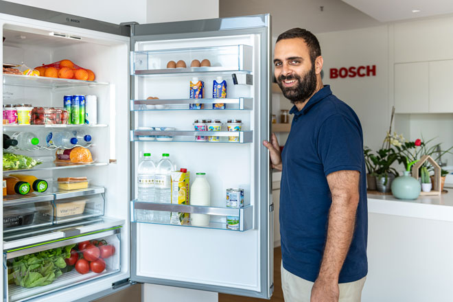 Για καλή μας τύχη η τεχνολογία έχει εξελιχθεί αρκετά. Πλέον, μέσα από την εφαρμογή Home Connect, μπορώ να δω ανά πάσα στιγμή στο κινητό μου τι έχει μέσα το ψυγείο μου. Με τις δύο έξυπνες κάμερες που είναι τοποθετημένες στον ελεύθερο ψυγειοκαταψύκτη Bosch με 70 εκατοστά πλάτος, έχω συνεχή πληροφορία στο κινητό μου για το τι μου λείπει και τι έχω σε πλεόνασμα. Το Smart Food Management δεν είναι σενάριο φαντασίας, είναι πραγματικότητα.