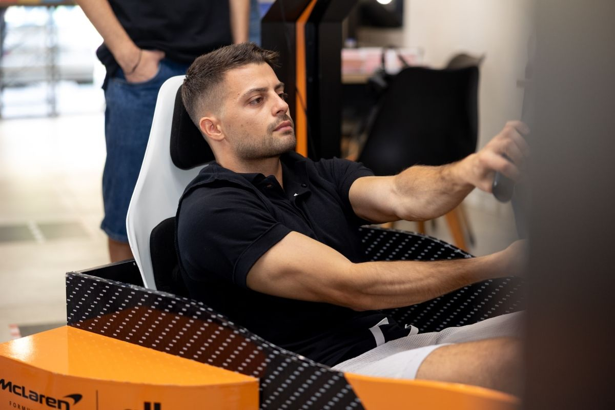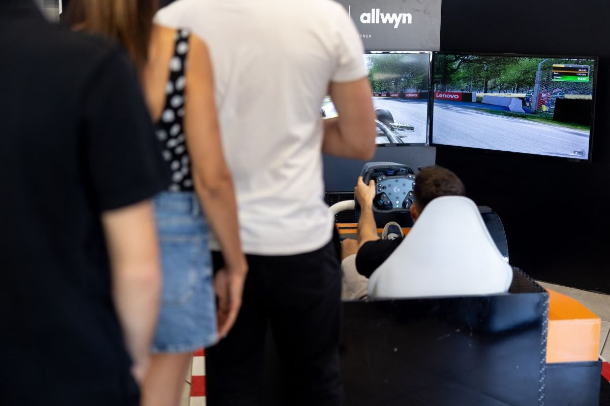 Με τρεις μεγάλες οθόνες και ήχο που θυμίζει κινητήρα αγωνιστικού αυτοκινήτου, ο προσομοιωτής μεταφέρει τους επισκέπτες σε όποια πίστα επιλέξουν για να ζήσουν μια αυθεντική εμπειρία Formula 1.