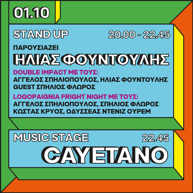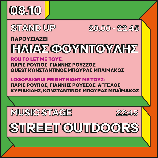 Όμως, δεν τελειώσαμε εδώ. Κι αυτό, διότι ακολουθεί και δεύτερο τριήμερο, το οποίο ξεκινάει την Παρασκευή 8 Οκτωβρίου με ακόμη ένα stand up comedy, κατά τη διάρκεια του οποίου ο Ηλίας Φουντούλης μαζί με τους Πάρι Ρούπο, Γιάννη Ρούσσο, Κωνσταντίνο Μπούρα Μπαϊμάκο και Άγγελο Κυριακίδη θα σας κάνουν να γελάσετε με την ψυχή σας. Στη συνέχεια, οι Street Outdoors θα ανέβουν στο stage για να κλείσει αυτή η τέλεια βραδιά.