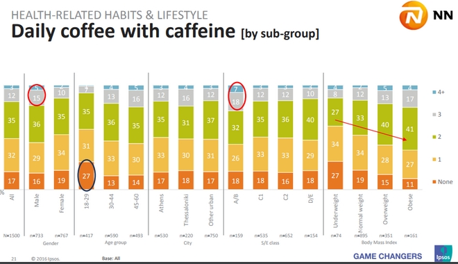 Ένας μύθος, αυτός που θέλει την νεολαία να πίνει περισσότερο καφέ, καταρρίπτεται και επίσημα από την έρευνα. Η παγκόσμια τάση που θέλει την νεολαία να ακολουθεί ένα πιο προσεγμένο τρόπο ζωής στις καθημερινές της συνήθειες βρίσκει εφαρμογή και στην Ελλάδα. Σύμφωνα με την έρευνα η μη κατανάλωση καφέ στις ηλικίες 18-29 είναι σχεδόν διπλάσια σε σχέση με τις υπόλοιπες ηλικιακές ομάδες. Συγκεκριμένα οι νέοι σε ποσοστό 27% απάντησαν ότι δεν πίνουν ούτε ένα καφέ την ημέρα όταν στην ηλιακή ζώνη 30-44 το ποσοστό πέφτει σε 13% και στους 45-60 σε 14%. Οι τελευταίοι είναι και πρωταθλητές στις υψηλές καταναλώσεις.