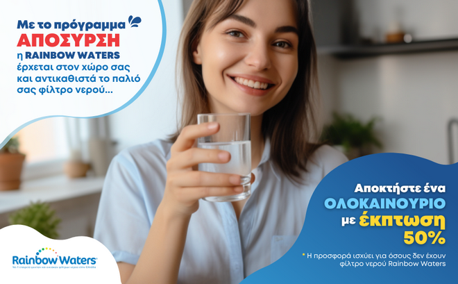 Η Rainbow Waters, κορυφαία εταιρεία στους ψύκτες εμφιαλωμένου νερού, καινοτομεί για ακόμα μια φορά, παρέχοντας σε όσους δεν έχουν ήδη αποκτήσει ένα από τα φίλτρα νερού της, να αποσύρουν το παλιό τους φίλτρο, εύκολα και γρήγορα, κερδίζοντας έκπτωση 50%.