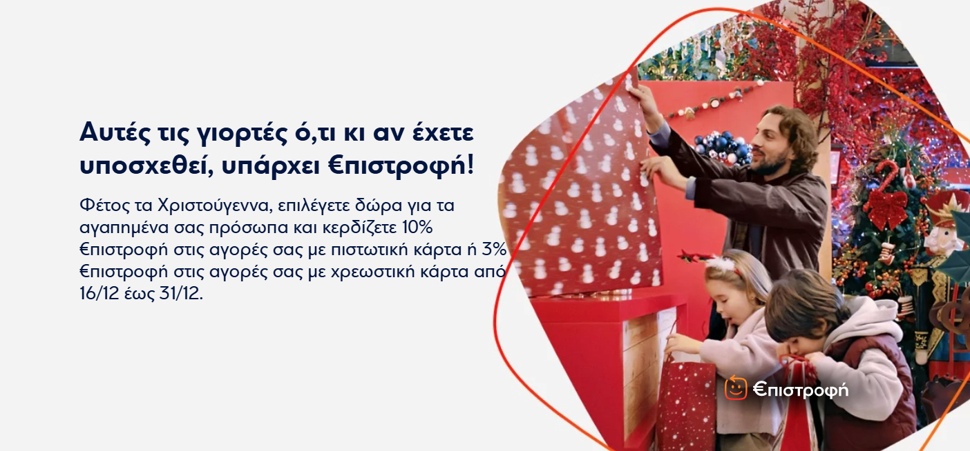 Οργανώνοντας ένα πάρτι για τις φετινές γιορτές, σίγουρα έχετε να πραγματοποιήσετε πολλές αγορές: αντικείμενα για τη διακόσμηση του σπιτιού και δώρα για τους φίλους και την οικογένειά σας. Φέτος, κάνοντας τις γιορτινές αγορές σας με κάρτες Eurobank που συμμετέχουν στο Πρόγραμμα κερδίζετε 10% €πιστροφή με πιστωτικές ή 3% €πιστροφή με χρεωστικές σε επιλεγμένους συνεργάτες. Ισχύει έως και 31.12 σε Πλαίσιο, attica, ΙΚΕΑ, INTERSPORT, Marks & Spencer, DPAM, Anna Maria Mazaraki και Pet City. Ισχύουν πρόσθετοι όροι και προϋποθέσεις ανά συνεργάτη. Ενημερωθείτε αναλυτικά στο eurobank.gr/epistrofi.