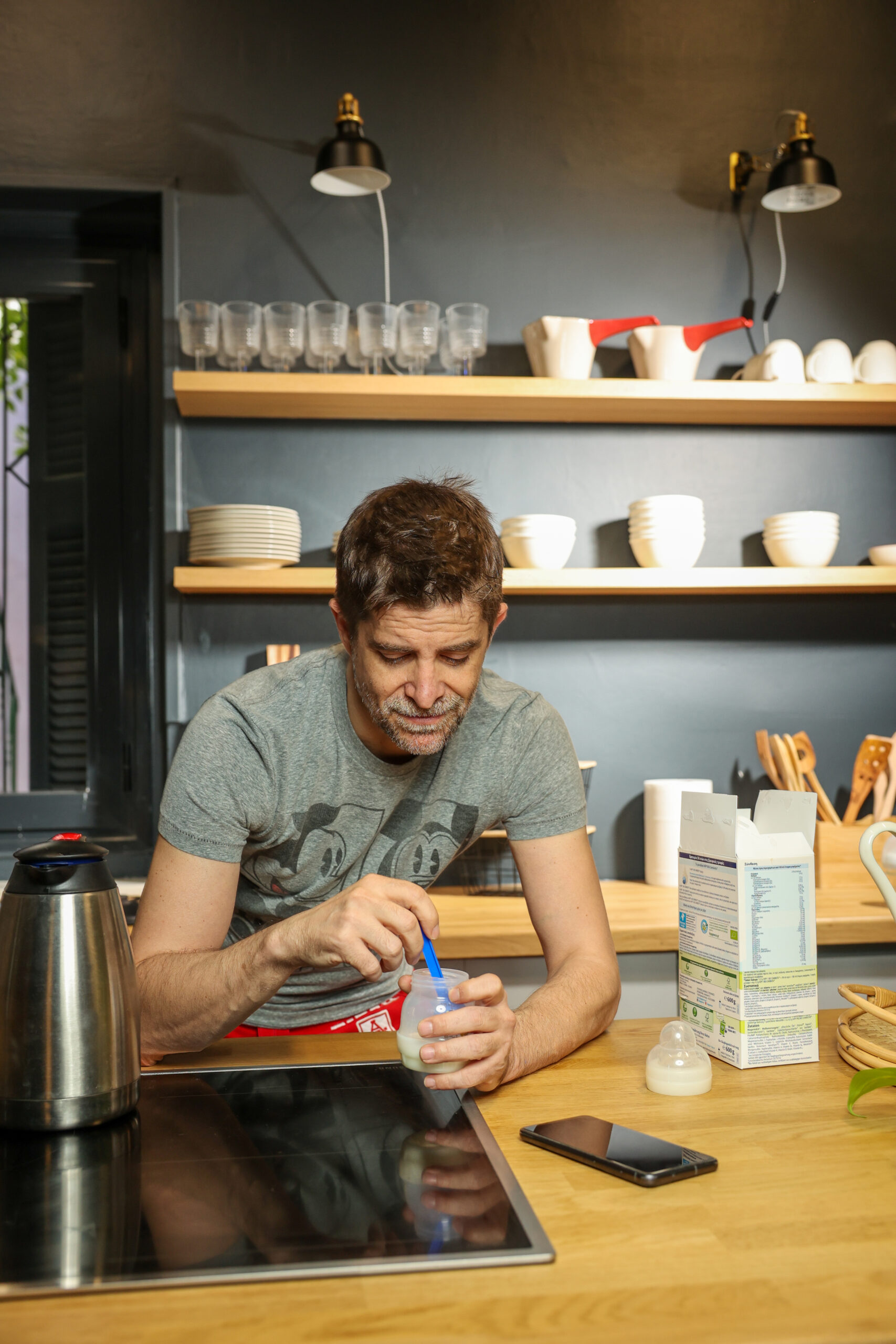 “O Παντελής Διαμαντόπουλος ετοιμάζει το γάλα του μωρού, όσο ενημερώνεται για τα αποτελέσματα των χθεσινών αγώνων.