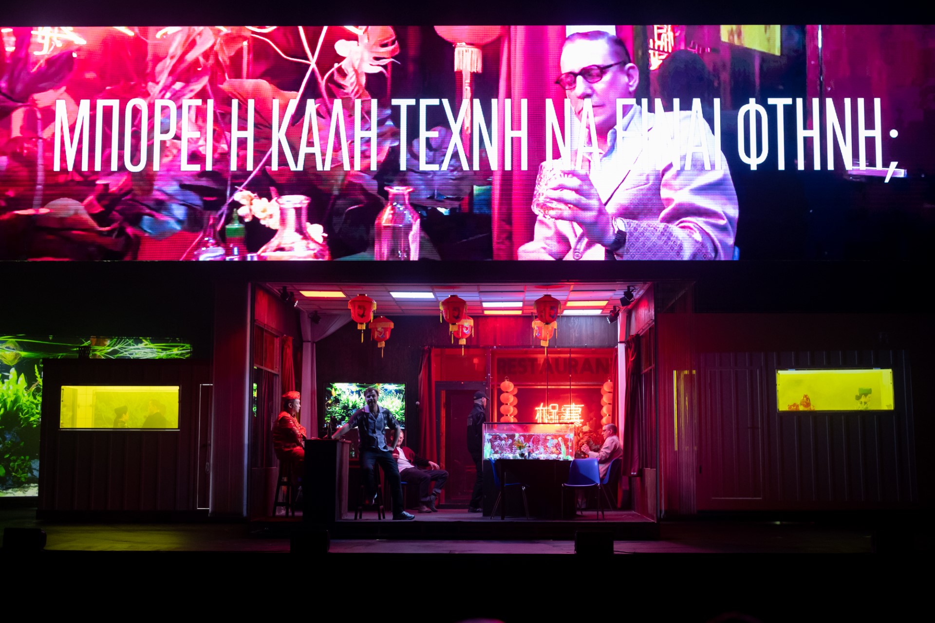 Tα σκηνικά κυριολεκτικά “χορεύουν” στην παράσταση αυτή. Στροβιλίζονται, σπάνε στη μέση, βυθίζονται, δημιουργούν διαρκώς νέους κόσμους και χρονοσύμπαντα και μάλιστα όλο αυτό σε μία απόλυτη αρμονία με τις γιγαντοοθόνες, τους μεθυστικούς φωτισμούς και τα κινηματογραφικά φίλτρα των προβολών. Δεν είναι λίγες οι φορές που η σκηνή παίρνει άλλες διαστάσεις μέσα από τον συνδυασμό αυτό δίνοντας την εντύπωση πως μπαίνεις μέσα σε μία χρονοκάψουλα και διακτινίζεσαι κάπου αλλού.