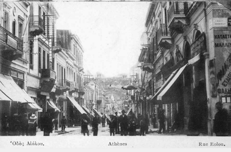 (Καρτ-ποστάλ με την οδό Αιόλου, δεκαετία 1910 © Ελληνικό Λογοτεχνικό και Ιστορικό Αρχείο Μορφωτικού Ιδρύματος Εθνικής Τραπέζης [ΕΛΙΑ/ΜΙΕΤ])