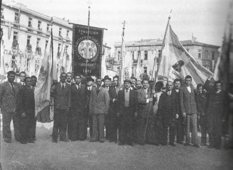 (Μέλη επαγγελματικών σωματείων, με τις σημαίες τους, πριν τη συμμετοχή σε εκδήλωση, Μεσοπόλεμος © ΕΡΤ Α.Ε.  Φωτογραφικό αρχείο Πέτρου Πουλίδη. Αρ. φωτογραφίας 17102)