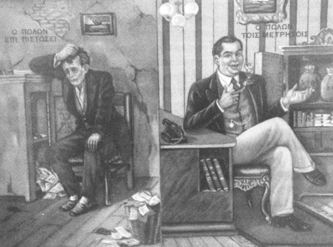(«Ο πωλών επί πιστώσει και ο πωλών τοις μετρητοίς»: λιθογραφία αγνώστου καλλιτέχνη, πολύ συνηθισμένη στα καταστήματα)