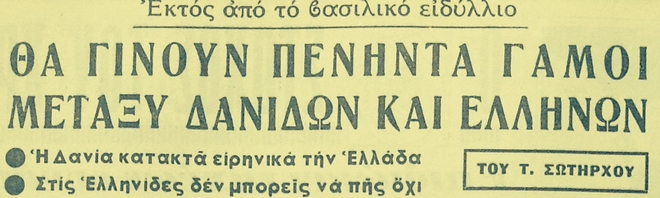 …Φαίνεται ότι ταιριάζουν πολύ οι Έλληνες με τις Δανέζες, ανέφερε Αθηναίος ξενοδόχος, διότι αμέσως γνωρίζονται, γίνονται καλοί φίλοι και η αλληλογραφία μεταξύ Ελλάδος και Δανίας διογκώνονται… Εννοείται όμως ότι και οι Δανοί δεν υστερούν. Αγκιστώνονται με την ίδια ευκολία από τις ακαταμάχητες Ελληνίδες.
