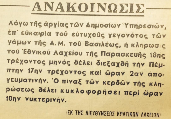 Νωρίτερα είχε δοθεί η ενημέρωση ότι οι Αθηναίοι και οι Πειραιώτες που έχουν συσκευές τηλεοράσεως και επιθυμούσαν να παρακολουθήσουν την γαμήλια πομπή θα έπρεπε η “αντέννα λήψεως” να έχει κατεύθυνση προς τον Λυκαβηττό, όπου έχει εγκατασταθή ο πομπός.