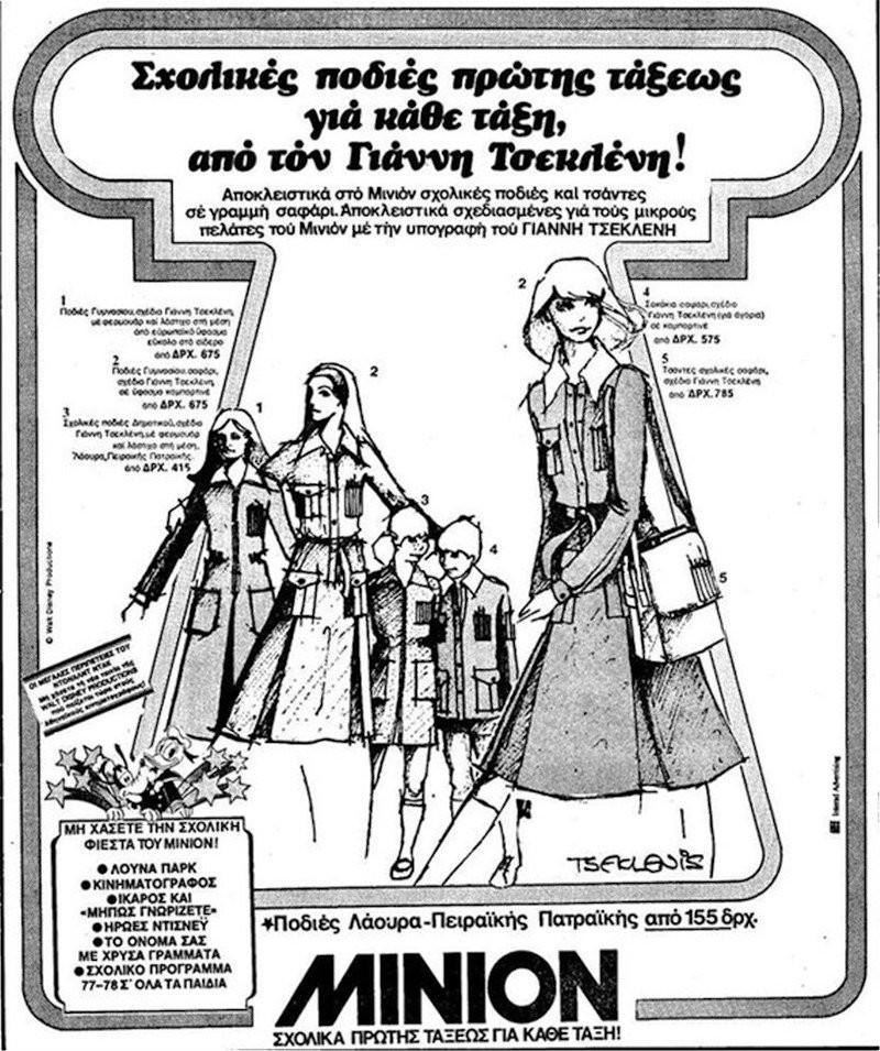 Η συνεργασία του Γιάννη Τσεκλένη με το “Μινιόν” προς το τέλος της δεκαετίας του 70 κάνει την ποδιά και θέμα μόδας. Μια ποδιά με την υπογραφή του Έλληνα μόδιστρου στοιχίζει ακόμη και 1.750 δραχμές, διπλάσια τιμή από τις άλλες … χωρίς μάρκα και την αίγλη του Τσεκλένη.