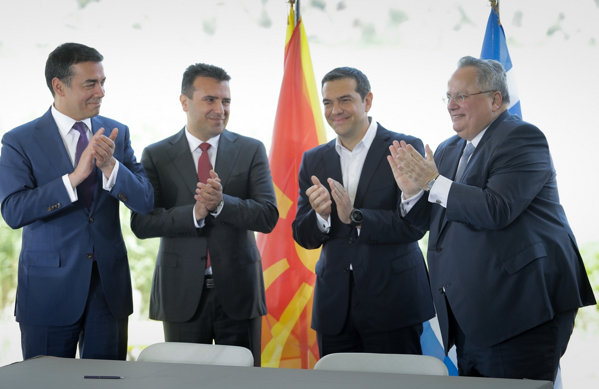 Η Συμφωνία υπεγράφη στις 17 Ιουνίου 2018 σε μια υψηλού επιπέδου τελετή στο συνοριακό χωριό Ψαράδες στη Λίμνη της Μεγάλης Πρέσπας, από τους τότε, δύο Υπουργούς Εξωτερικών Νικολά Ντιμιτρόφ και Νίκο Κοτζιά ενώπιον των Πρωθυπουργών Ζόραν Ζάεφ και Αλέξη Τσίπρα.