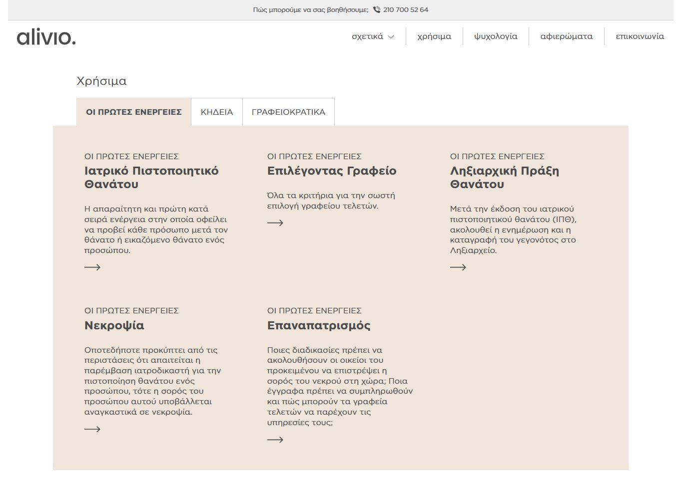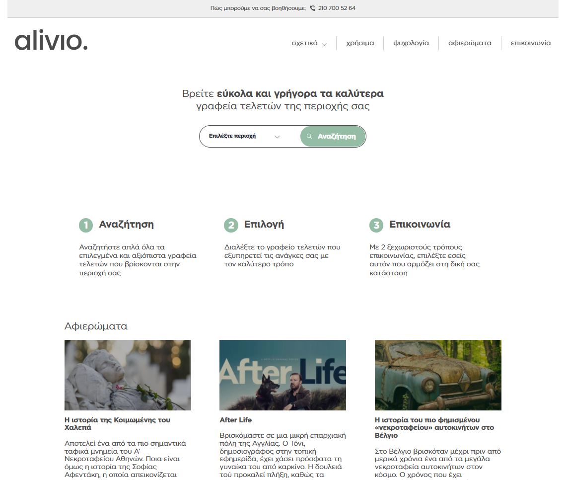Το Alivio.gr έρχεται να διευκολύνει τον άνθρωπο που έχει χάσει ένα αγαπημένο του πρόσωπο, παρέχοντας στήριξη τόσο σε πρακτικό όσο και σε ψυχολογικό επίπεδο. Πρόκειται για μία πλατφόρμα που λειτουργεί, αφενός, ως μηχανή αναζήτησης για την εύρεση του κατάλληλου Γραφείου Τελετών με λεπτομερή περιγραφή των υπηρεσιών που προσφέρει το καθένα, ώστε ο αναγνώστης να μπορεί να επιλέξει εκείνο που ανταποκρίνεται στις ανάγκες και τις επιθυμίες του. Επίσης, παρέχει χρήσιμες πληροφορίες γύρω από τις πρώτες ενέργειες που πρέπει να γίνουν, τη διαδικασία της κηδείας και τα γραφειοκρατικά ζητήματα που ενδέχεται να προκύψουν. Αφετέρου, το site παρέχει πρωτογενές περιεχόμενο με εξειδικευμένα άρθρα ψυχολογικής υποστήριξης και διαχείρισης του πένθους, θέματα σχετικά με την κουλτούρα του θανάτου, ειδικά αφιερώματα και συνεντεύξεις.