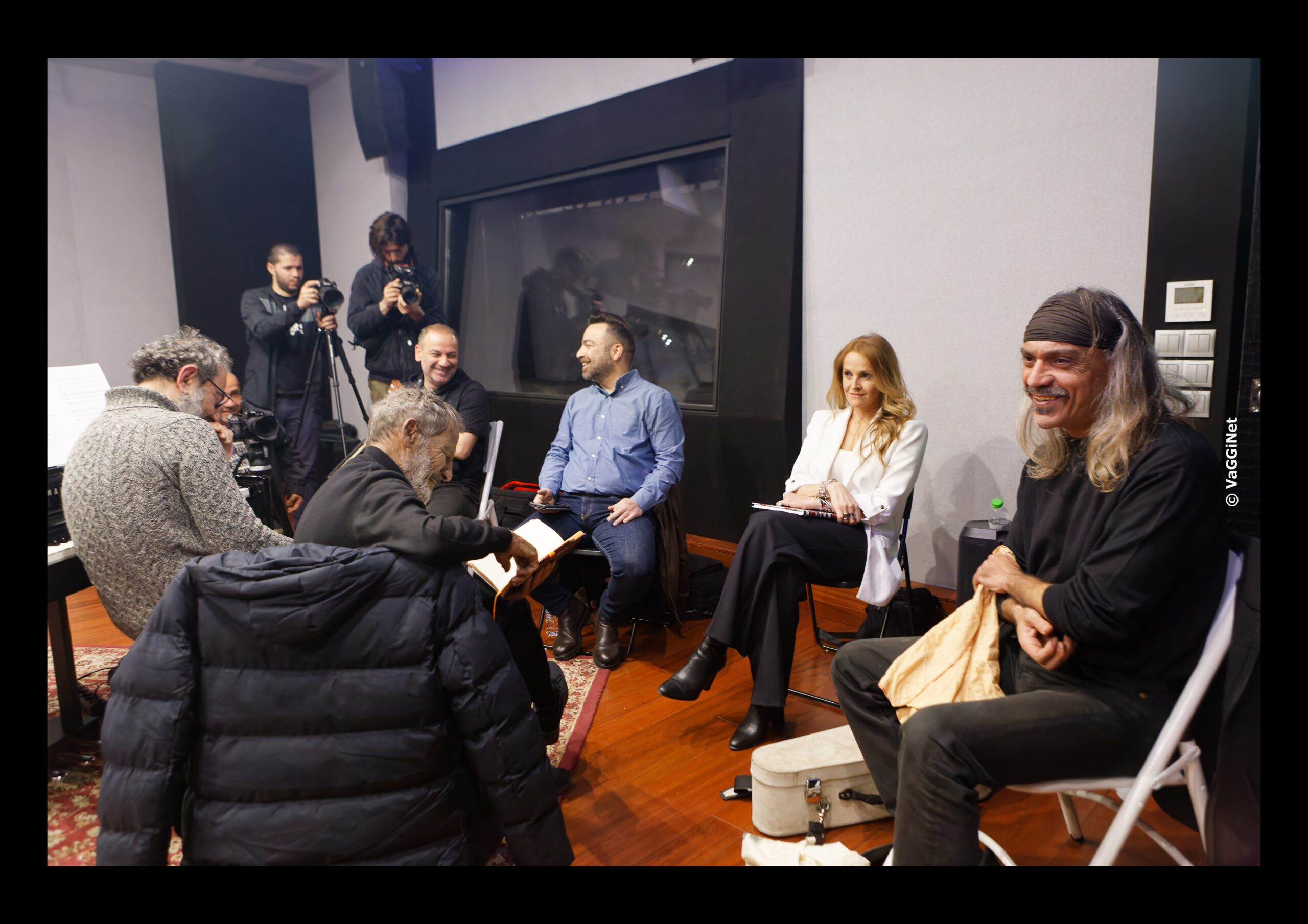Στην κεντρική αίθουσα του στούντιο ηχογράφησης οι βασικοί συντελεστές της συναυλίας κάθονται μπροστά μας κοιτάζοντας με σεβασμό τον μαέστρο Σταύρο Ξαρχάκο. Μιλώντας στους δημοσιογράφους, κάτι που κάνει σπάνια, ο σπουδαίος μουσικοσυνθέτης αναφέρθηκε στο αγαπημένο του θέμα: την παράδοση. “Σήμερα οι συντελεστές της παράστασης – εκτός από την ορχήστρα – βρισκόμαστε για πρώτη φορά, ώστε να πούμε τα πιο ιδιαίτερα πράγματα μεταξύ μας. Σε δύο πράγματα, κατά την άποψή μου, κουμπώνει η ψυχή μας – στην ιστορία και στην παράδοση.