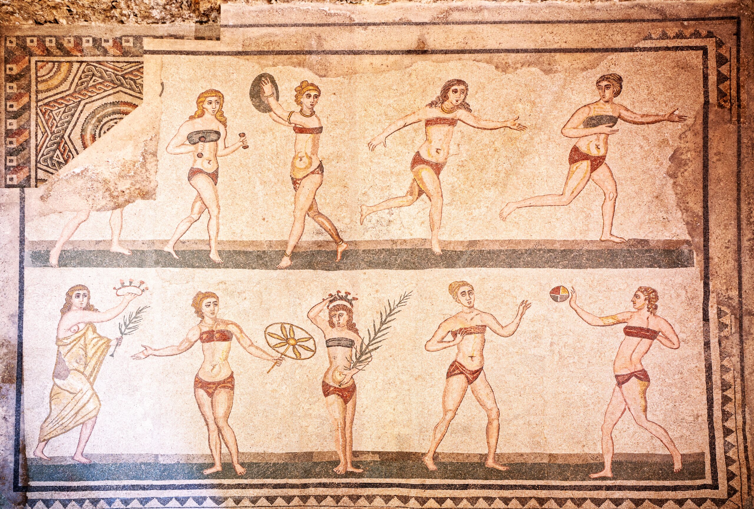 Σε αυτή τη ρωμαϊκή έπαυλη, ο Ιταλός αρχαιολόγος Τζίνο Βινίτσιο Τζεντίλι, ανακάλυψε το 1960 ένα ψηφιδωτό στο δάπεδο ενός δωματίου, γνωστού πλέον ως “αίθουσα των δέκα κορασίδων” (κάποιοι το αποκαλούν και “η στέψη του νικητή”). Σε αυτό το ψηφιδωτό απεικονίζονται νεαρές γυναίκες που ανταγωνίζονται σε αθλήματα όπως η άρση βαρών, η δισκοβολία, το τρέξιμο και κάποιο παιχνίδι με μπάλα. Κάτω αριστερά, μια γυναίκα που φοράει τήβεννο, κρατάει τα τρόπαια της νίκης (ένα στεφάνι και ένα κλαδί φοίνικα), ενώ στο κέντρο του μωσαϊκού, εμφανίζεται στεφανωμένη η νικήτρια. Αυτό όμως που τραβάει περισσότερο την προσοχή, είναι ότι όλες οι κοπέλες φορούν ένδυμα δυο τεμαχίων, που θυμίζει σε μεγάλο βαθμό τα σημερινά μπικίνι.