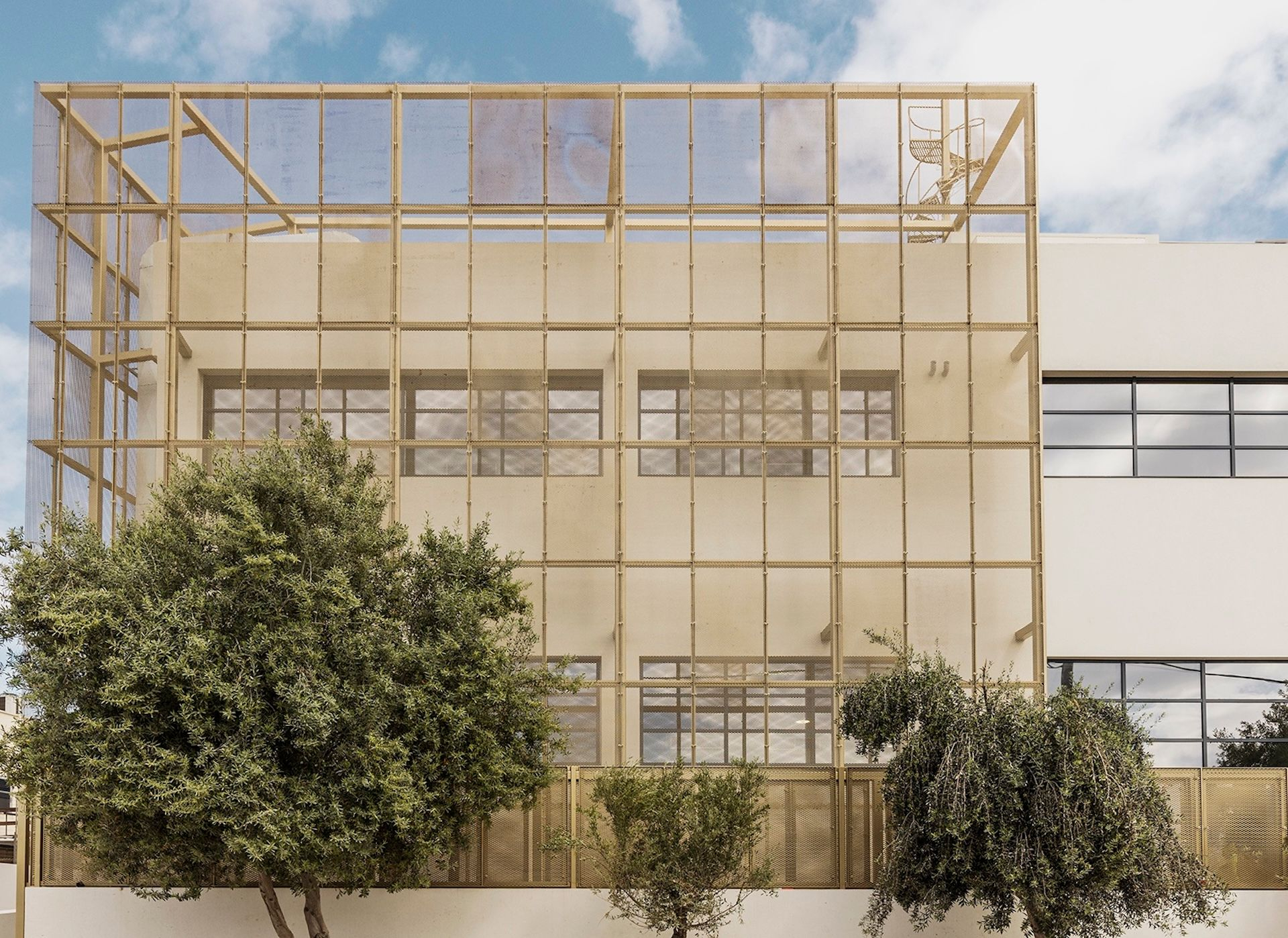 Τα μεταλλικά δοκάρια της πρόσοψης και μεγάλοι σωλήνες είναι βαμμένα με χρυσή ματ μπογιά, γυαλίζουν στον ήλιο σαν να έχουν τοποθετηθεί εκεί για να μπερδέψουν το βλέμμα: δεν δηλώνουν πολυτέλεια, μοιάζουν περισσότερο με ένα ειρωνικό σχόλιο πάνω στην ανάγκη μας να εντυπωσιαζόμαστε πριν ακόμη δούμε το περιεχόμενο.
