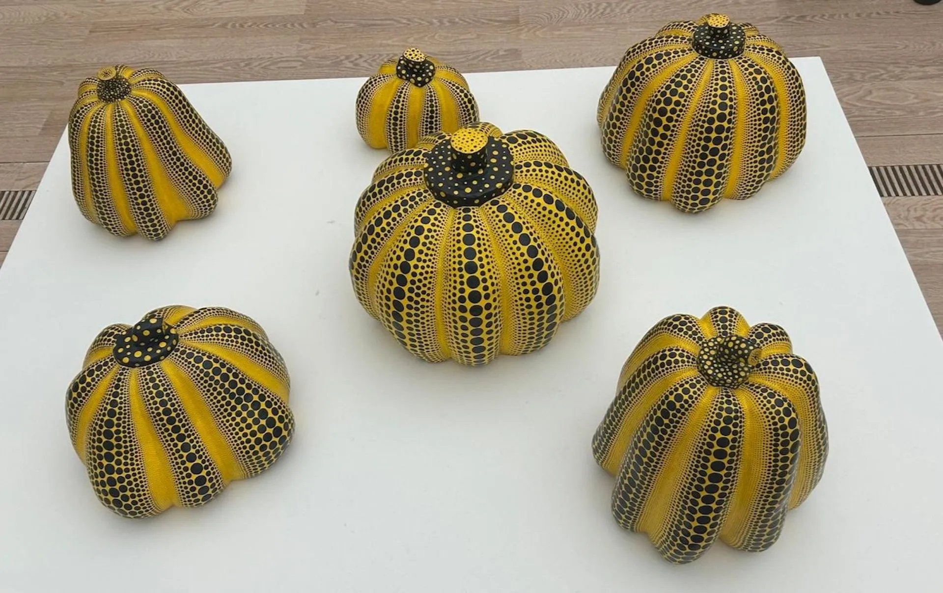 Κολοκύθες μικρής και μεγάλης κλίμακας, ζωγραφισμένες σε καμβά ή παρουσιασμένες ως γλυπτά —από papier-mâché και κεραμικό έως πλαστικό ενισχυμένο με ίνες— όλες καλυμμένες με πουά σε υποδέχονται στο τόσο χαρακτηριστικά αναγνωρίσιμο και οικείο σύμπαν της Kusama.