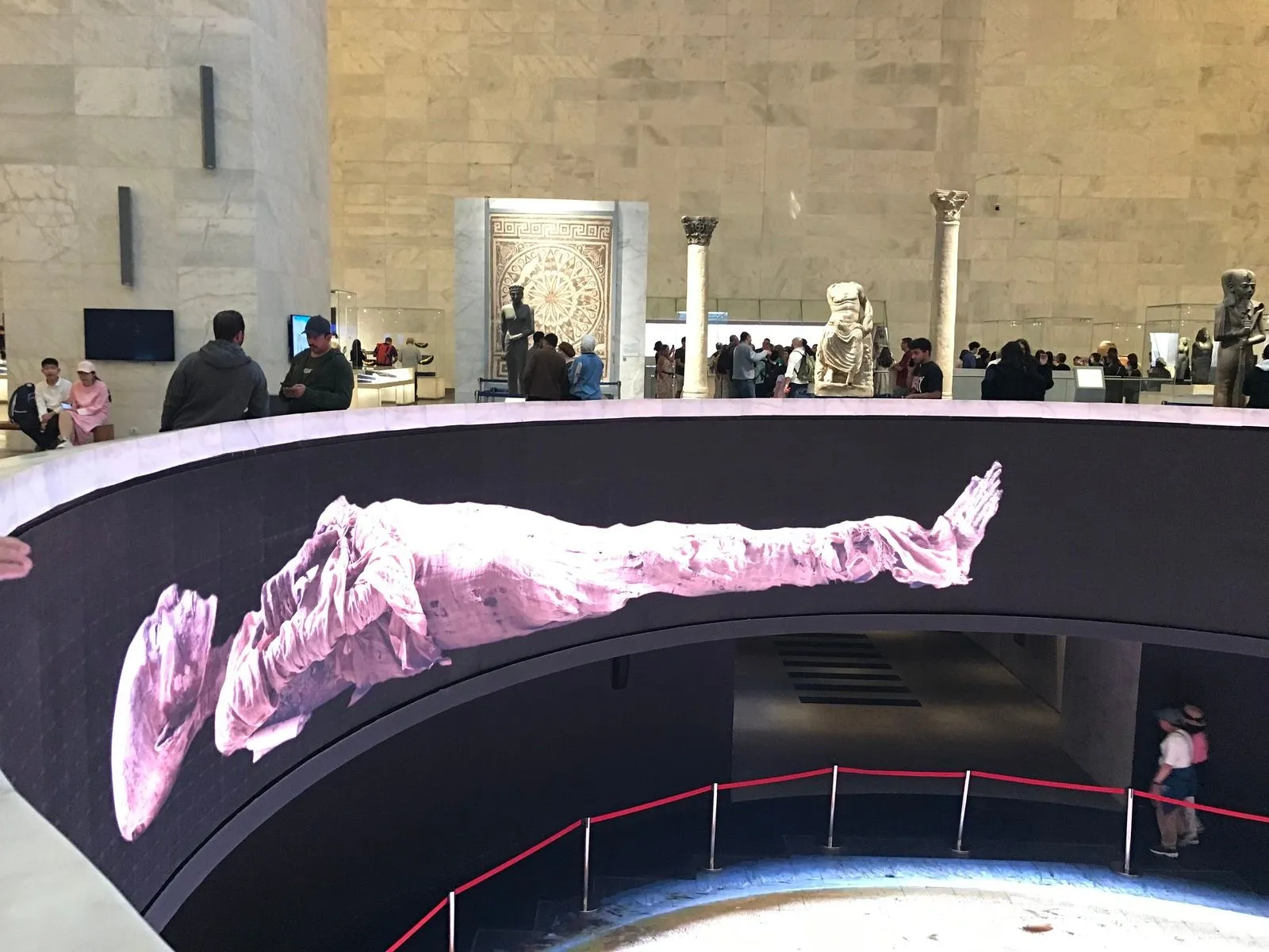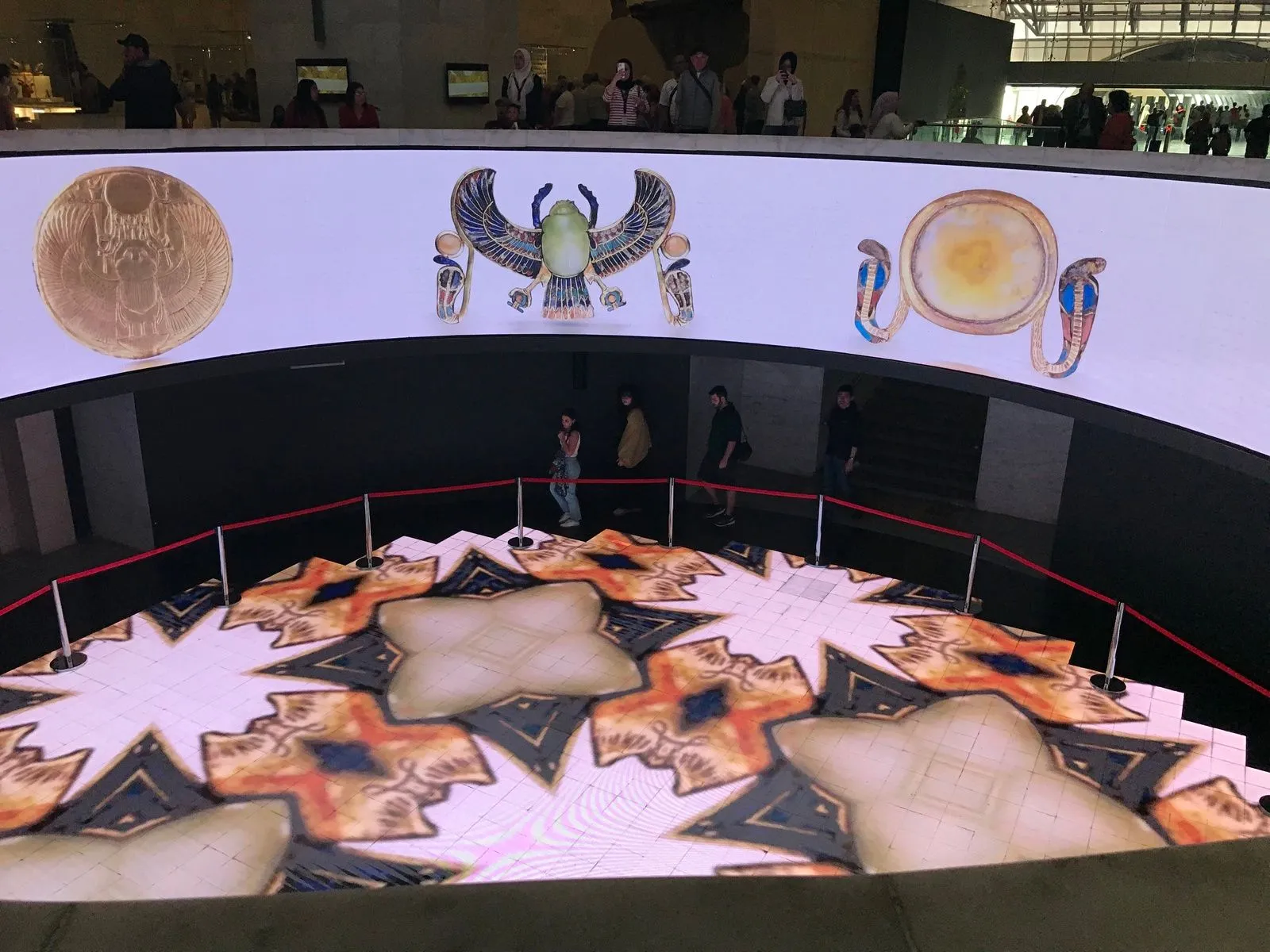 Κατεβαίνοντας προς την Αίθουσα των Βασιλικών Μουμιών, ο φωτισμός αλλάζει και ο ρυθμός επιβραδύνεται. Ο χώρος λειτουργεί σαν υπόγειος θάλαμος μνήμης. Λίγο πριν φτάσουμε εκεί, ένας κυκλοτερής προθάλαμος με ψηφιακές προβολές μάς θυμίζει τον κύκλο της Ιστορίας και της ζωής. Πολύ ψηλά από πάνω μας η οροφή του κτιρίου είναι μια ανεστραμμένη πυραμίδα.