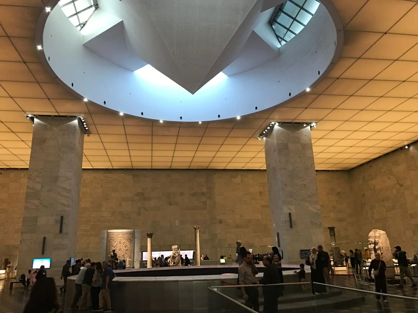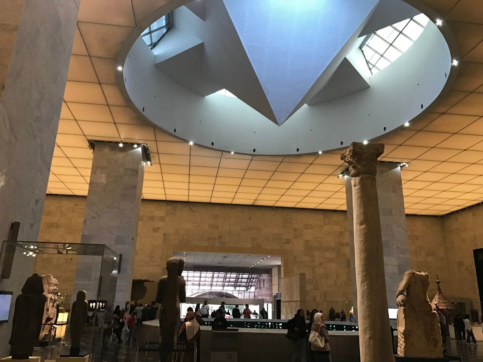 Αρχιτεκτονικά λιτό και σύγχρονο, επιλέγει χαμηλό φωτισμό και καθαρές γραμμές, ώστε τα αντικείμενα να αναδεικνύονται χωρίς σκηνοθετική υπερβολή. Το κτίριο δεσπόζει μάλλον απρόσωπο έχει όμως ένα ατού αδιαπράγματευτο. Δίπλα του απλώνεται η λίμνη Αΐν ελ-Σίρα, μια ήσυχη υδάτινη επιφάνεια που λειτουργεί σαν φυσικό προαύλιο. Το νερό αντανακλά τον όγκο του κτιρίου και μαλακώνει τη γεωμετρία του, δημιουργώντας μια μετάβαση από την αστική ένταση του Καΐρου σε έναν πιο στοχαστικό ρυθμό. Πριν ακόμη περάσεις την είσοδο, η λίμνη επιβάλλει παύση. Μοιάζει περίεργο οι μούμιες να βρίσκονται περίπου στην επιφάνεια μιας λίμνης…