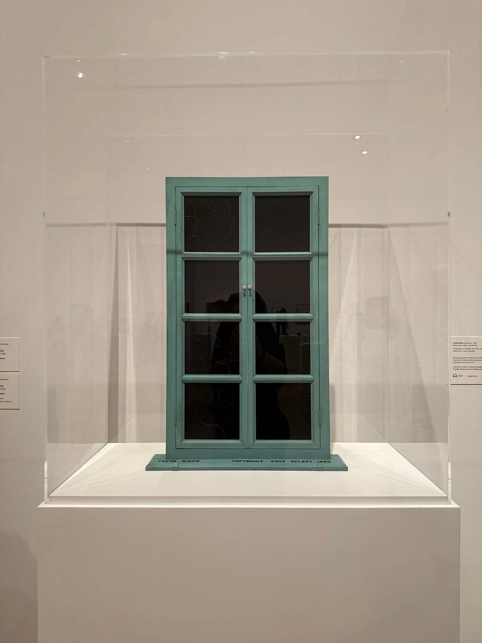 Το έργο είναι μια “ανάγνωση” του παραδοσιακού παραθύρου, όμως, αντί για μια κλασική αναπαράσταση, ο Duchamp αποδίδει μια ενδιαφέρουσα, υποκειμενική προσέγγιση μέσω ενός απλού, αλλά πολύ φορτισμένου συμβόλου: πρόκειται για μια παράθυρο-όψη, σε έναν κυρίως σκοτεινό χώρο, φτιαγμένο από μαύρο ξύλο, με γυάλινα παράθυρα.