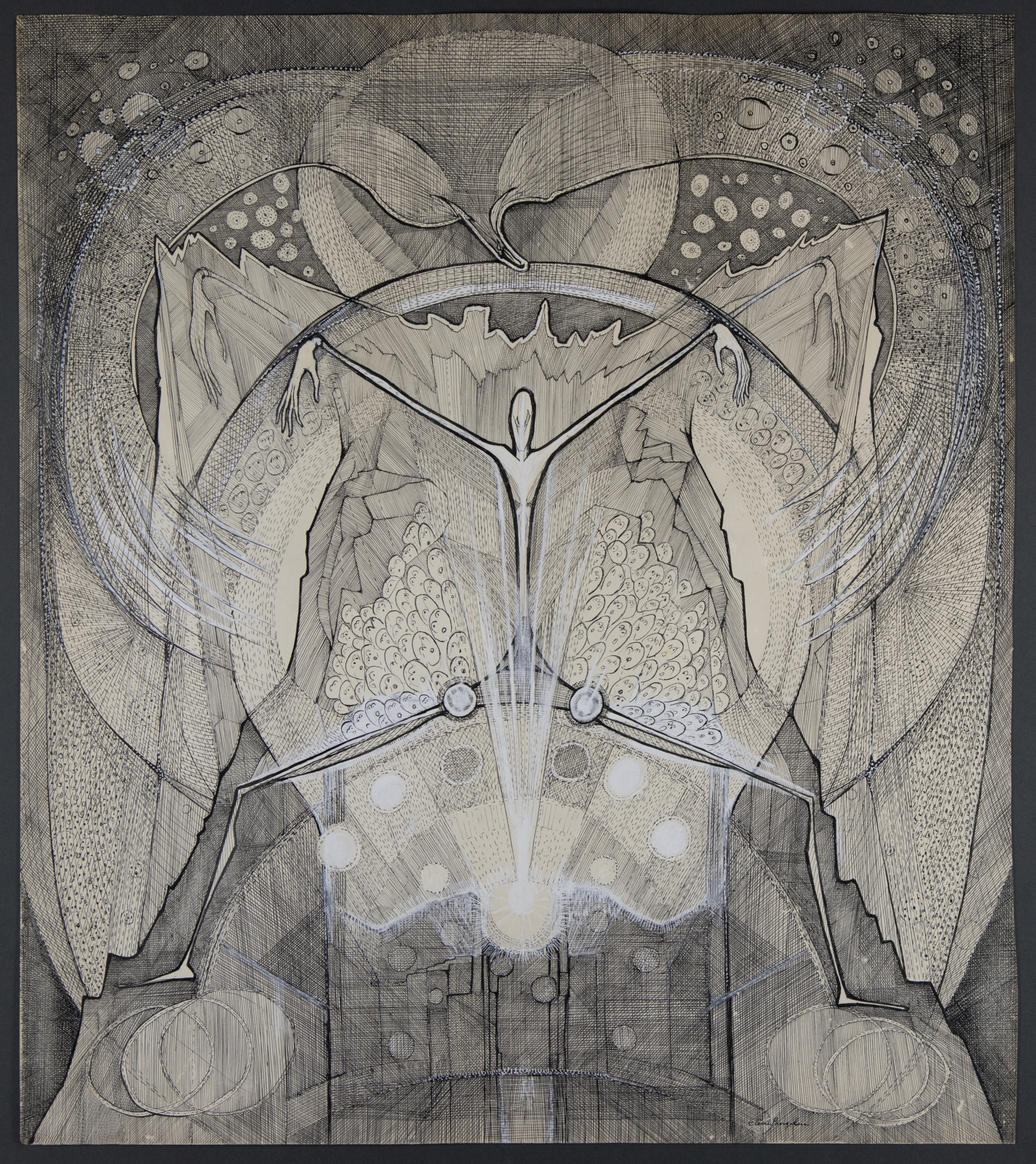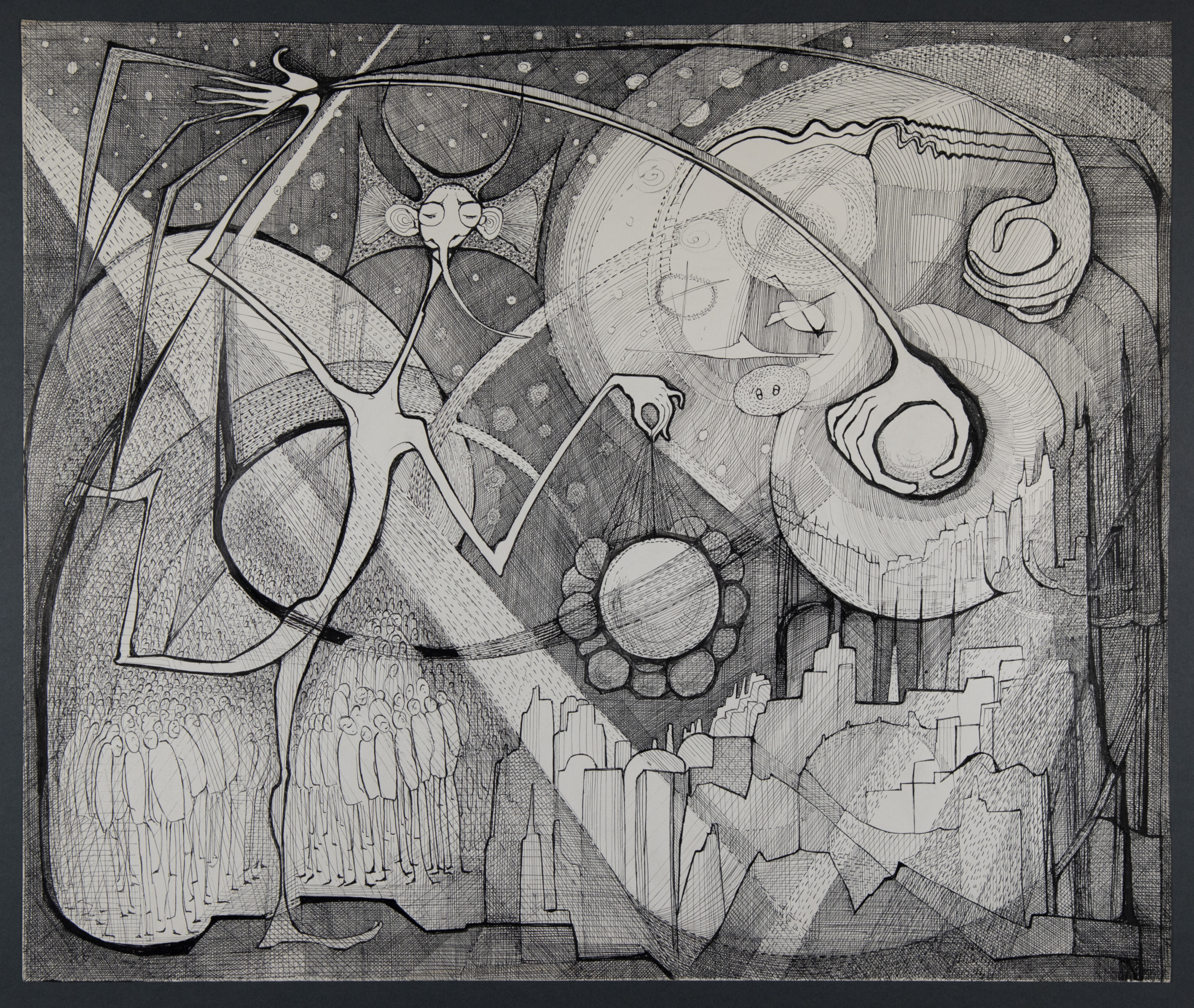 Στο ΕΜΣΤ βλέπουμε μια σειρά πρωτότυπων ασπρόμαυρων σχεδίων (μελάνι σε χαρτί) που κινούνται στον χώρο του φαντασιακού, της ψυχικής ενόρασης και των μεταφυσικών προβληματισμών. Οστεώδεις άφυλες μορφές, μεταξύ ανθρώπου, δαίμονα και εντόμου, δίνουν την εντύπωση ότι έχουν δημιουργηθεί από ένα χέρι σε κατάσταση ψυχικού… τρανς.