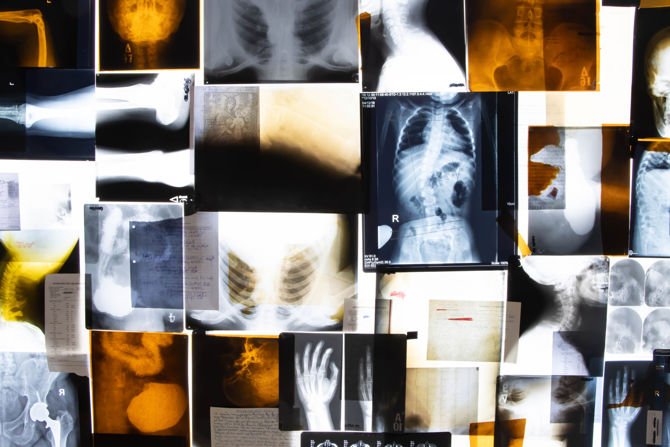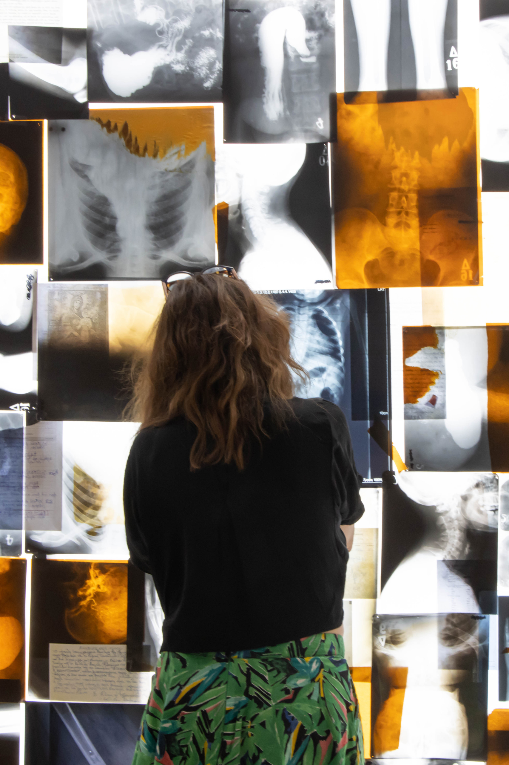 Στος 2ο όροφο η εγκατάσταση της Εύας Στεφανή σχεδόν κόβει την ανάσα. Έχεις πάει ποτέ σε νοσοκομείο; Έχεις βγάλει έστω και μία ακτινογραφία; Έχεις βρεθεί στη στιγμή που ο γιατρός την τοποθετεί στον φωτεινό πίνακα και το στομάχι σου σφίγγεται απότομα στη σκέψη μιας περίεργης διάγνωσης. Δεκάδες τέτοιες πλάκες όλων των σημείων του σώματος έχει τοποθετήσει η Εύα Στεφανή σε ένα φωτεινό box-δωμάτιο, φτιάχνοντας το έργο “Το Φωτεινό Σπήλαιο” .
