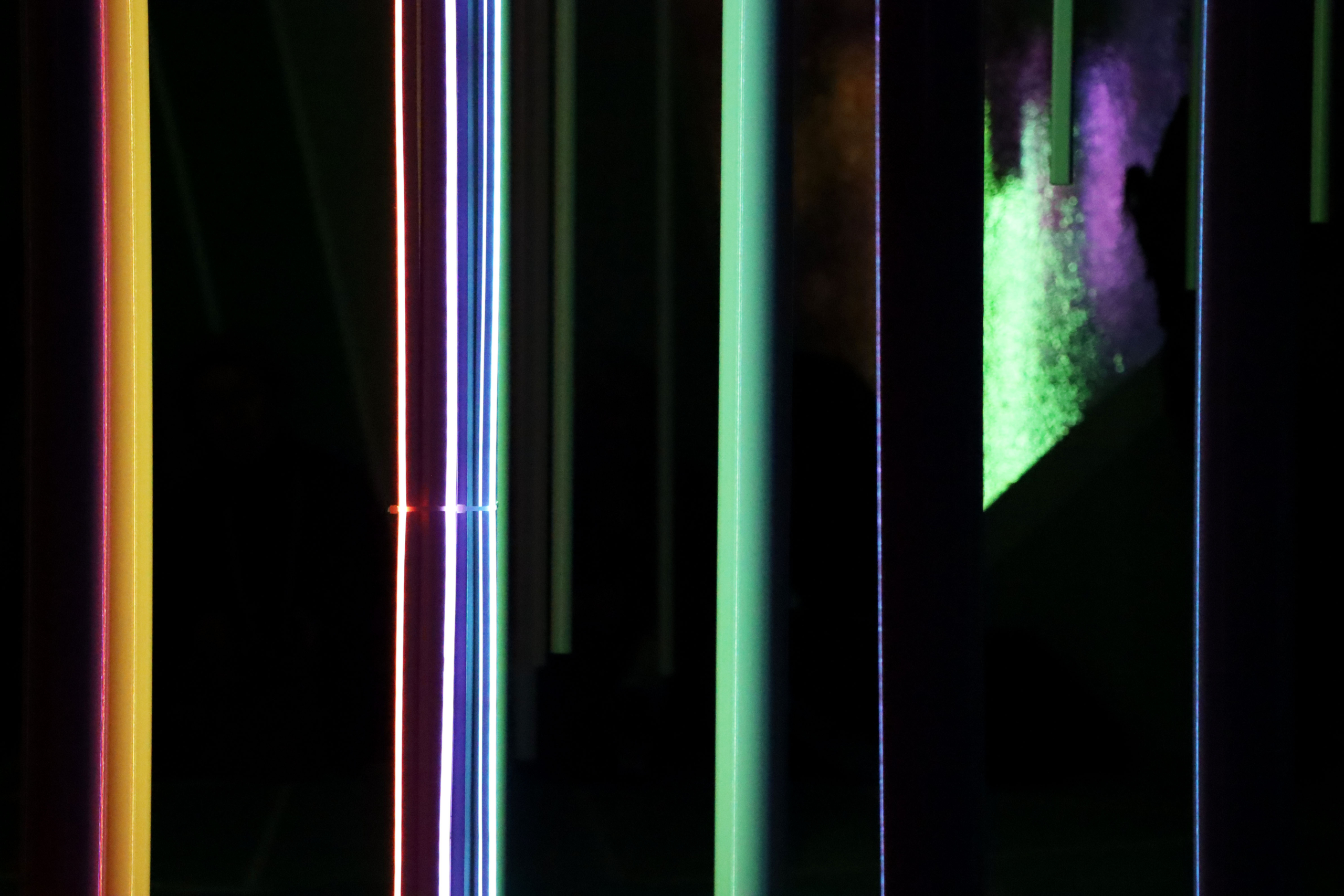 Ένα άλλο στοιχείο πάνω στο οποίο βασίστηκα είναι η ακολουθία Fibonacci, στην οποία κάθε αριθμός είναι το άθροισμα των δύο αριθμών που προηγούνται αυτού, κάτι με το οποίο είχε ασχοληθεί ο Ξενάκης ως μηχανικός και αρχιτέκτονας. Στο έργο ξεκινάμε από τη μέση, πολύ συμμετρικά, και μετά συνεχίζουμε πιο abstract σε κάθε βήμα. Ό,τι βλέπετε στην πραγματικότητα είναι φτιαγμένο με βάση την ακολουθία Fibonacci. Τα ύψη της κατασκευής, το μήκος των έξι μελωδών, το πολύχρωμο σχέδιο στο έδαφος που φτάνει στον τοίχο και ανυψώνεται – είναι όλα “χτισμένα” πάνω σε αυτή τη λογική. Προσπάθησα να δημιουργήσω ένα έργο που να συνδέεται και να πηγάζει από το έργο του Ξενάκη με μία σύγχρονη ματιά και άποψη.”