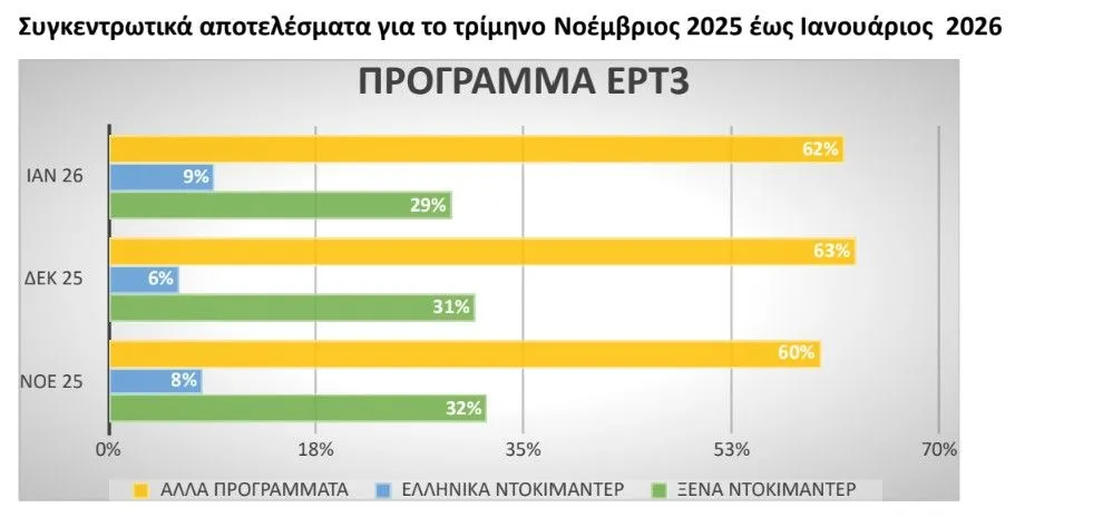 Με βάση λοιπόν τα στοιχεία που συγκέντρωσαν στο διάστημα Νοέμβριου 2025- Ιανουαρίου 2026, είδαν ότι μόλις το 1,9% του συνολικού προγράμματος της Δημόσιας Τηλεόρασης αποτελείται από ελληνικές σειρές ντοκιμαντέρ.