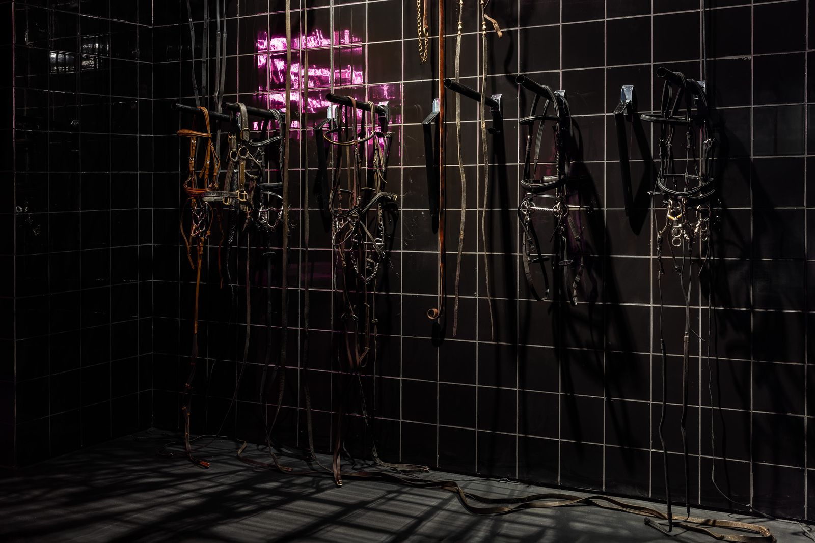 Μπαίνοντας στην πρώτη ατομική έκθεση της Τζάνις Ράφα στην Ελλάδα, με τίτλο “Εμείς που προδώσαμε τα άλογα” δε γίνεται να μην εκπλαγείς από την ατμόσφαιρα της αίθουσας. Ένας χώρος σκοτεινός, με ταΐστρες αλόγων και σέλες που αποπνέει ένταση και μυστήριο, ένας κόσμος γεμάτο από την απουσία του σώματος, την αποξένωση και τον πόνο.