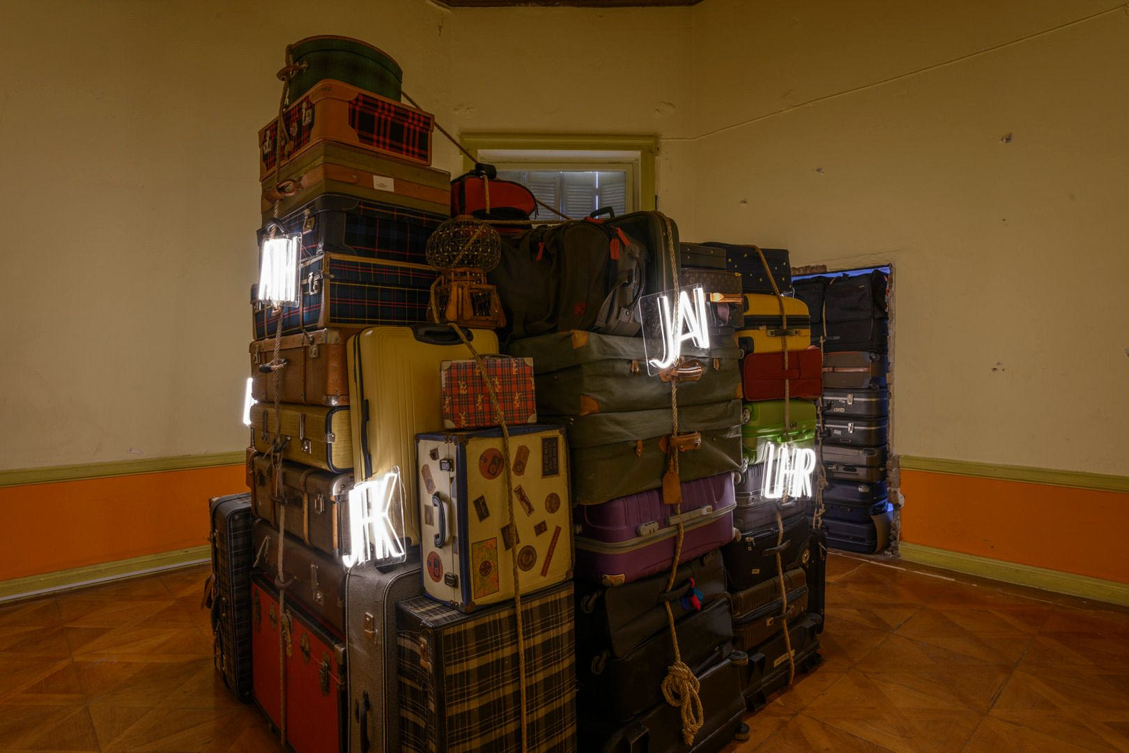 Οι βαλίτσες της Κλαίρης Τσαλουχίδου – Χατζημηνά στο έργο “Check in” βαριές και ανάλαφρες είναι σύμβολα ταξιδιων που έχουμε κάνει ή που αναμένουμε ακόμα να πραγματοποιηθούν. Οι φωτεινοί κωδικοί αεροδρομίων δεν είναι μόνο ενδείξεις προορισμών, αλλά φάροι που σηματοδοτουν την πορεία της ζωής, μέσα από την αλλαγή της εξωτερικής πραγματικότητας.