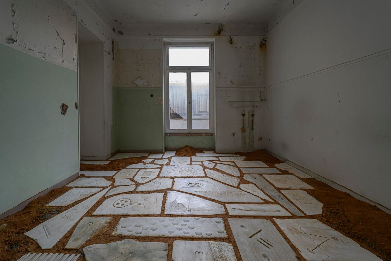 Εντυπωσιακό και το “Πέρασμα” του Γιώργου Κοντονικολάου όπου περπατήσαμε πάνω σε ένα κατακερματισμένο δάπεδο με μία περίτεχνη σύνθεση μαρμάρινων θραυσμάτων. Ακανόνιστα σχήματα, σπασμένα τμήματα και ακανόνιστες γεωμετρικές φόρμες που σκοπίμως δεν αλληλοσυνδέονται και τα κενά ανάμεσά τους γεμίζουν με χώμα. Σαν ένα υπό κατασκευή έργο, που όμως πάνω στο μάρμαρό του χαράσσονται οι στιγμές και τα γεγονότα που έχουν εκτυλιχθεί κατά την ιστορική διαδρομή του. Περπατάμε πάνω στο δάπεδο όπως θα διασχίζαμε το κτίριο ανασύροντας πληροφορίες για την ιστορία του. Μια διαδρομή που πλησιάζει προς την ολοκλήρωσή της.