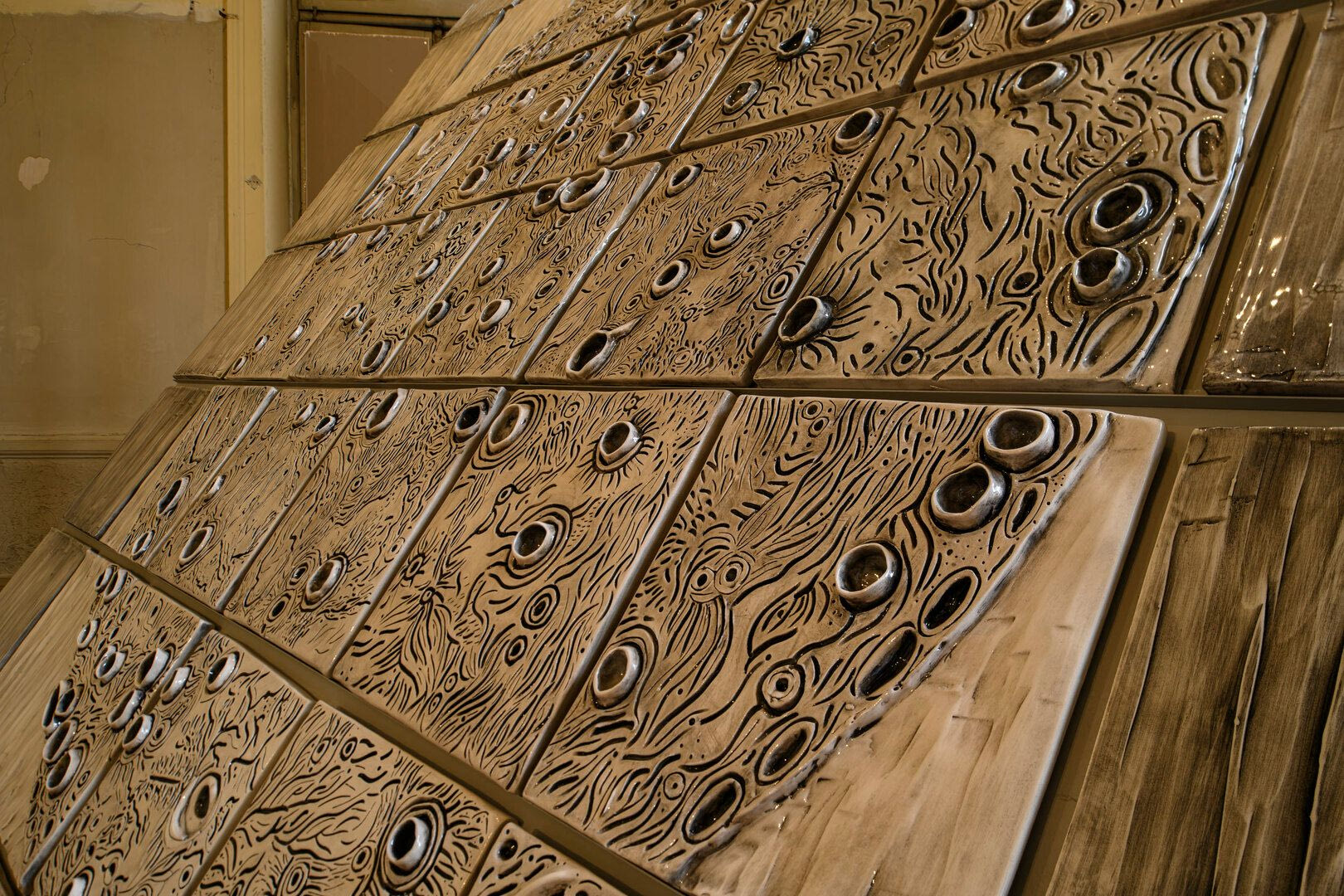 Οι “Ναυτικές Ιστορίες” της Δήμητρας Σκανδάλη έχουν δημιουργηθεί από ξύλα από σπασμένα καΐκια, δωρισμένα εργαλεία ψαράδων, σκοινιά και φύκια του Αιγαίου. Μια εγκατάσταση που ενσωματώνει υπολείμματα παραδοσιακών ξύλινων αλιευτικών σκαφών από το χωριό της Αλυκής στην Πάρο και από ναυπηγεία που καταστράφηκαν – ένας φόρος τιμής στην οικογενειακή παράδοση της καλλιτέχνιδος.
