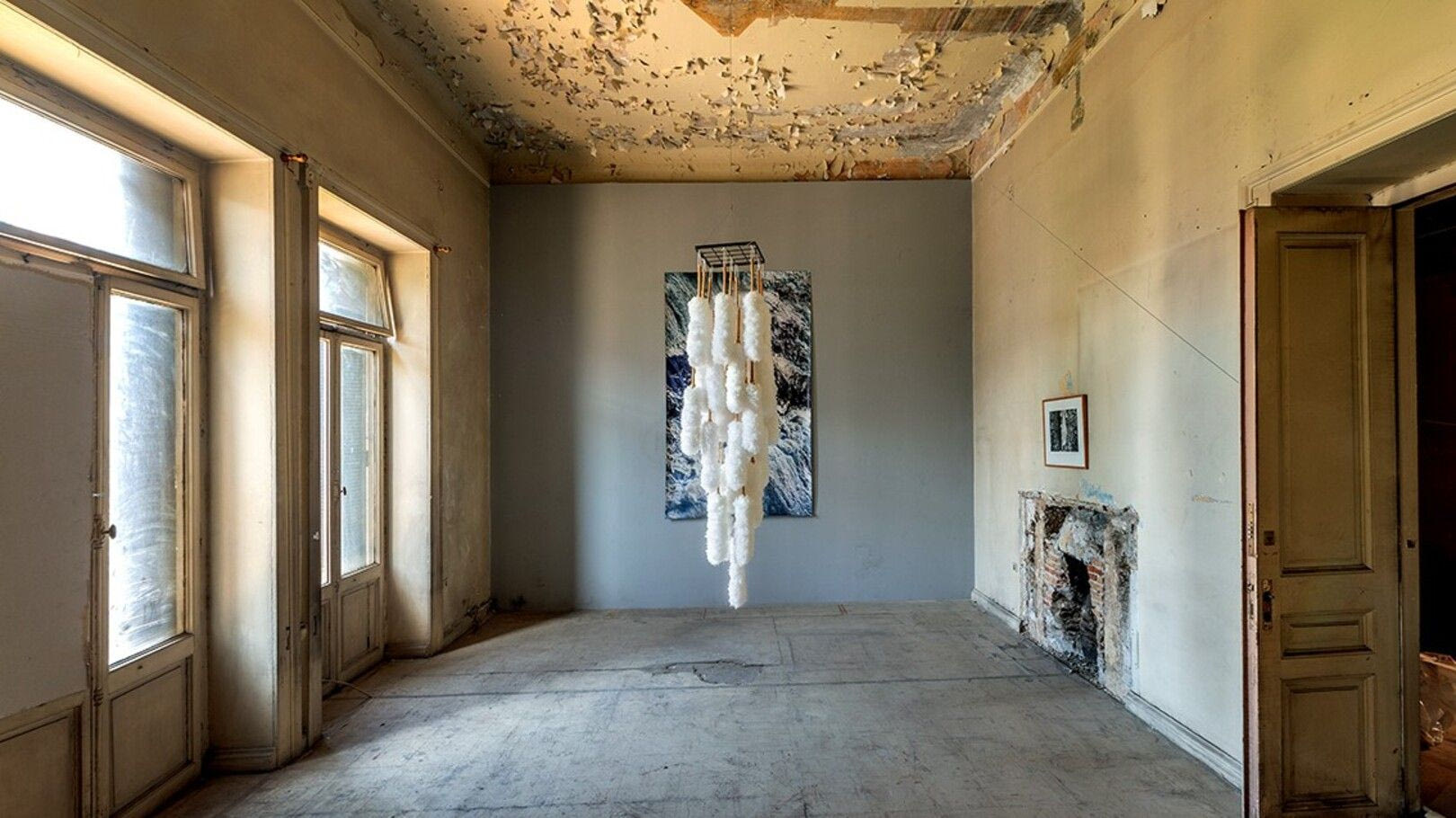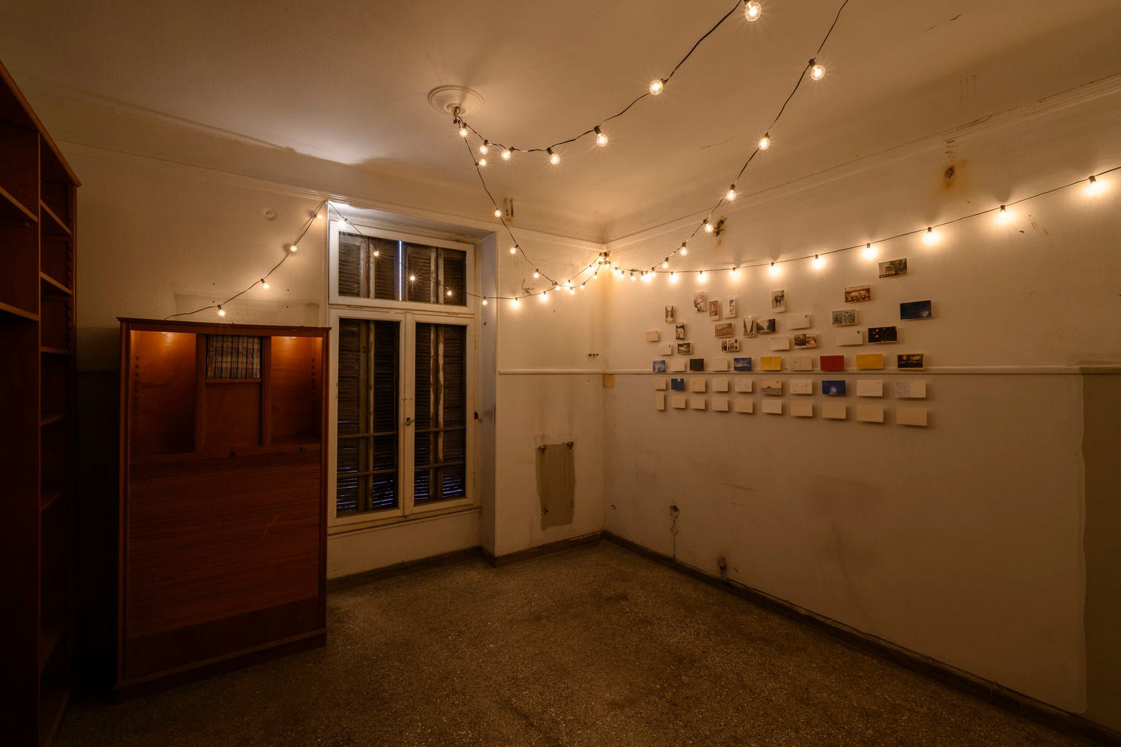 Φορώντας κλειστά παπούτσια, ακολουθώντας την οδηγία που έχει δοθεί για τους επισκέπτες, ανεβαίνουμε τα φθαρμένα σκαλιά, θαυμάζοντας αρχικά τον vintage παλιακό ανελκυστήρα που διαπερνά το κτίριο. Περπατώντας στους διαδρόμους του πρώτου και δεύτερου ορόφου του Μεγάρου, μπαίνουμε και βγαίνουμε στα ψηλοτάβανα δωμάτια που φιλοξενούν τα έργα, με μια προσμονή ανακάλυψης του δικού μας προσωπικού “ταξιδιού”.