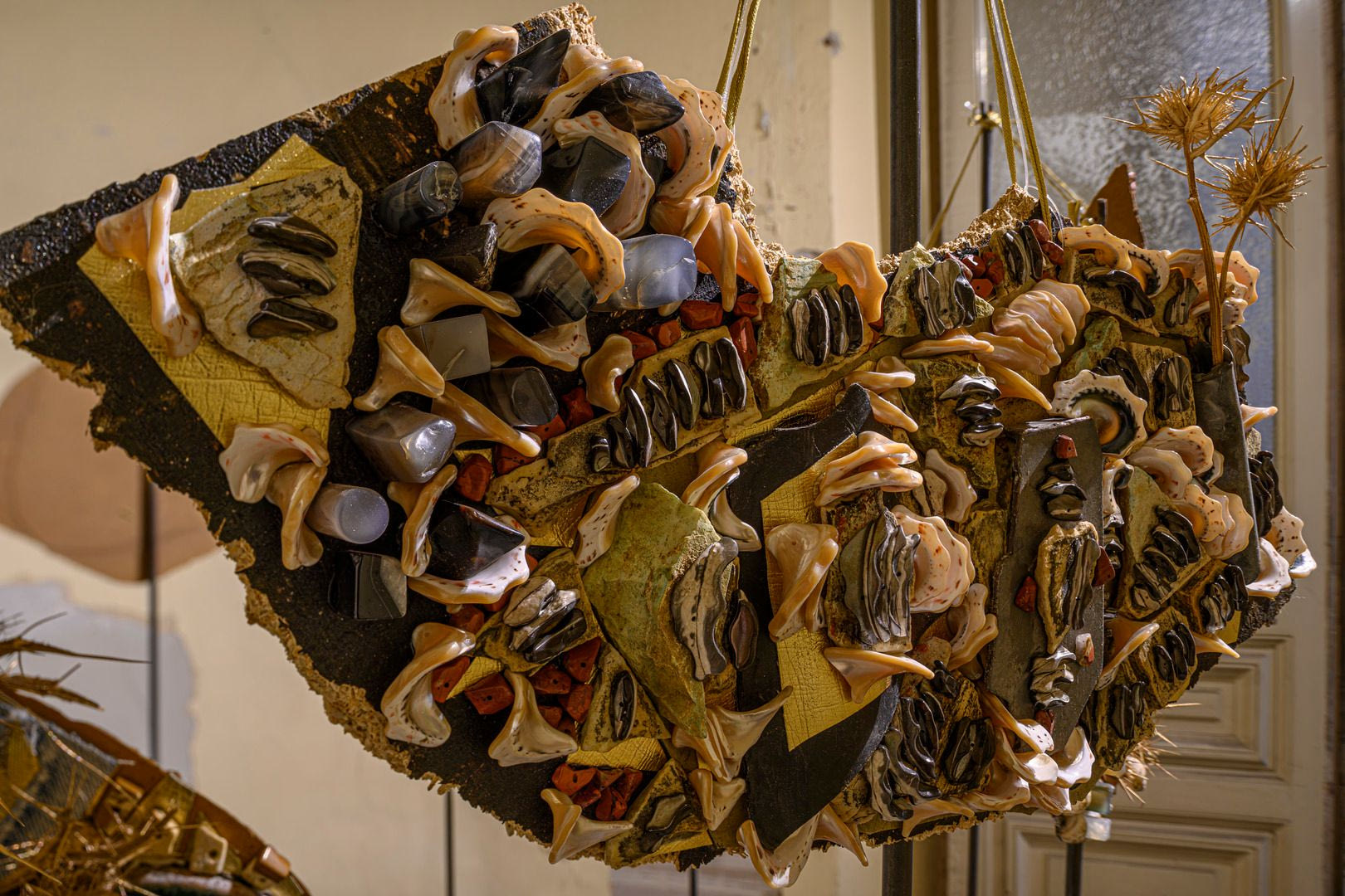 Στον πρώτο όροφο είδαμε και το έργο της Σοφίας Ζαράρη με τίτλο Fragments of a Glorious Past (2014). Μια αβαν γκαρντ σύνθεση «κοσμημάτων» από άχρηστα οικοδομικά υλικά που βρήκε στο κτήριο, μαζί με πέτρες, κοχύλια, αποξηραμένα φυτά, υφάσματα κλπ, εμπνευσμένη από τη γνωστή φωτογραφία της Σοφίας Εγκαστρωμένου-Σλήμαν, που απεικονίζεται στολισμένη με κοσμήματα από τον αμφιλεγόμενο Θησαυρό του Πριάμου της Τροίας, ένα από τα ζητήματα για τα οποία έχει ασκηθεί ιδιαίτερη κριτική από τους αρχαιολόγους στον Σλήμαν. Μια υπενθύμιση της εύθραυστης και κατακερματισμένης φύσης των ιστορικών αφηγήσεων.
