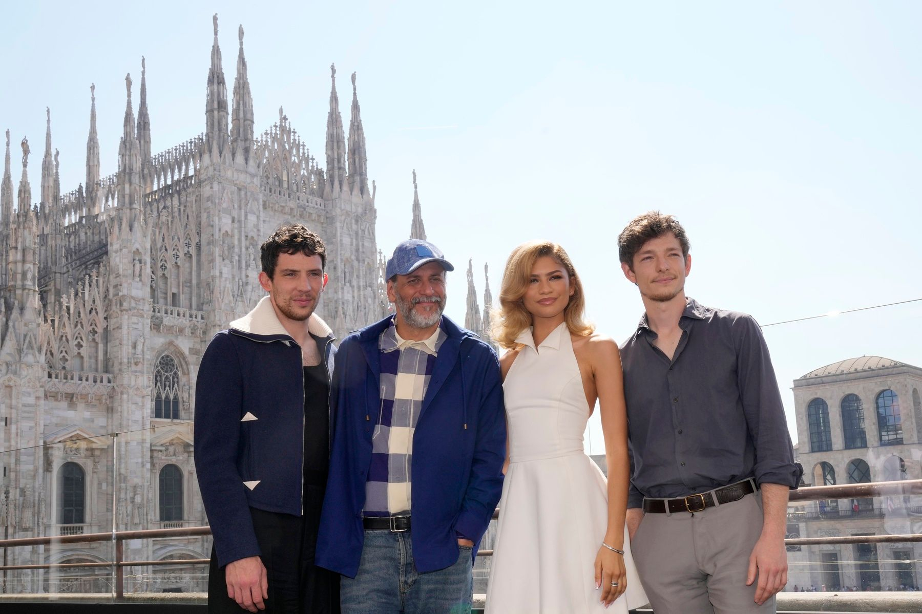 Ο Λούκα Γκουαντανίνο στο Μιλάνο με την πρωταγωνιστική τριπλέτα της προηγούμενης ταινίας του, Challengers: Ζεντέια, Μάικ Φάιστ και Τζος Ο'Κόνορ. AP Photo/Antonio Calanni