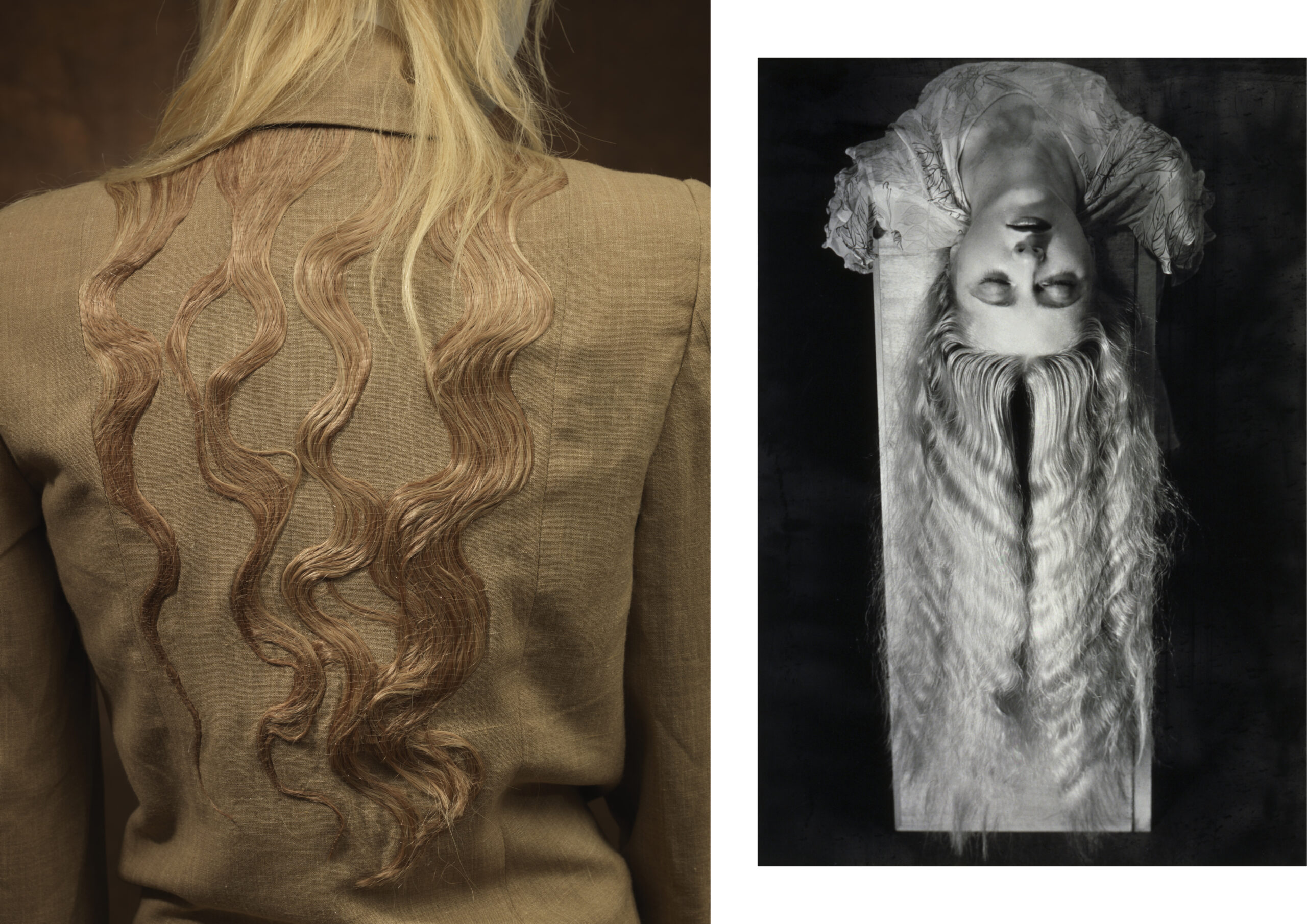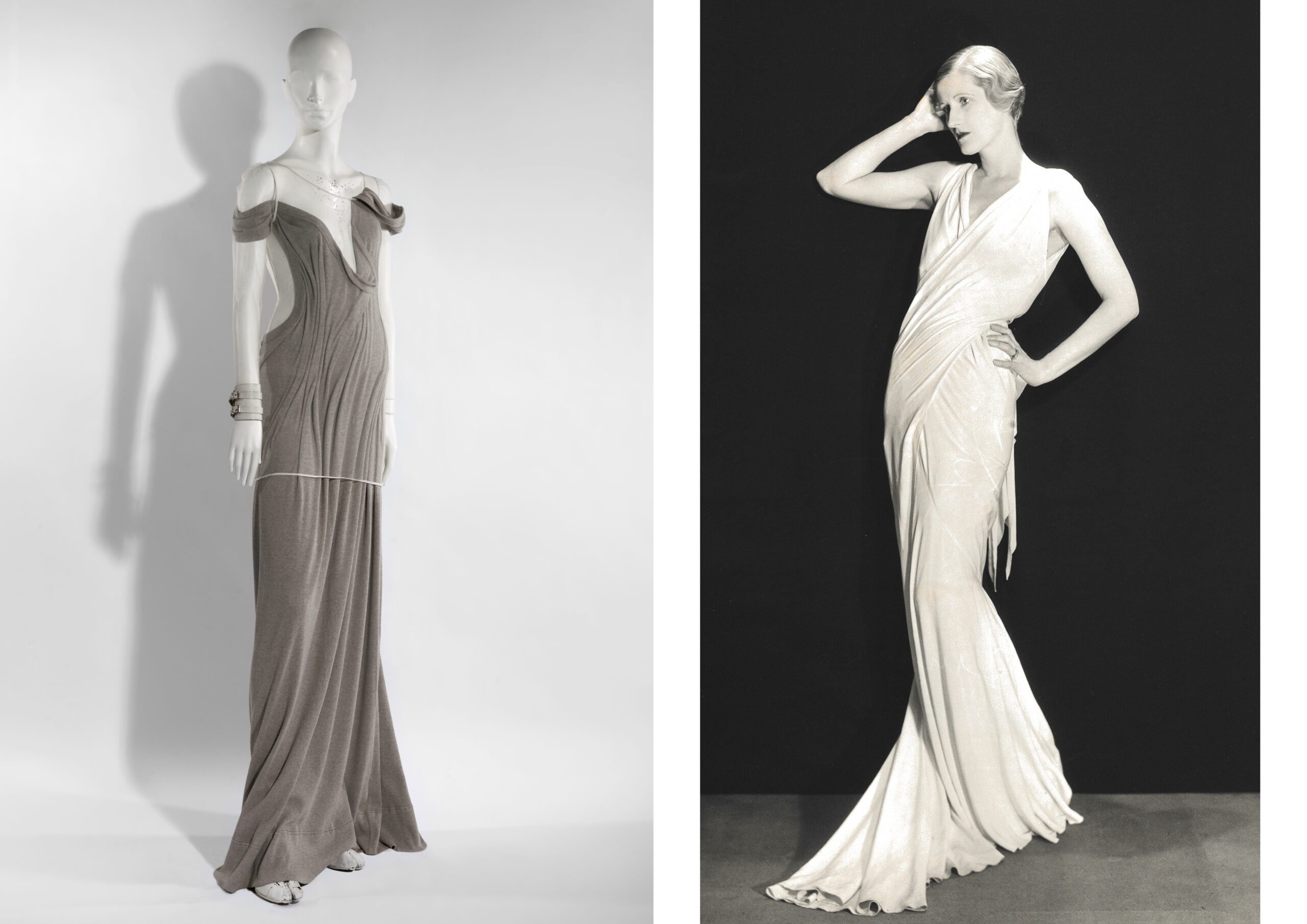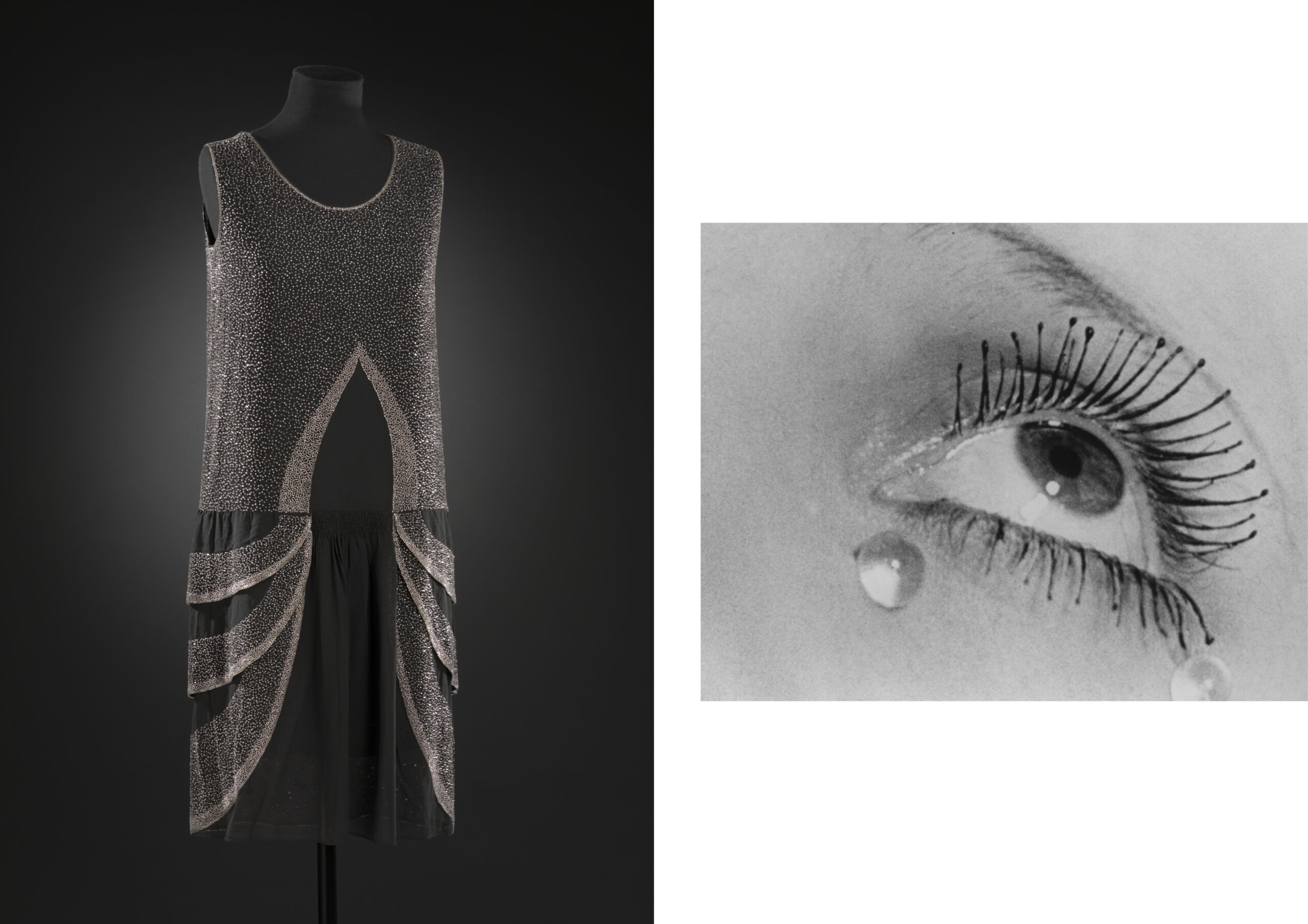 “Δεν είναι πάντα προφανές τι είναι φωτογραφία μόδας και τι όχι” λέει η επιμελήτρια της έκθεσης, Romy Cockx. “Ποιος άλλος θα μπορούσε να κολλήσει γυάλινες χάντρες αντί για δάκρυα στο πρόσωπο μιας γυναίκας (Les Larmes, 1932) και να το χρησιμοποιήσει για να πουλήσει τη μάσκαρα Cosmecil; Η διάσημη φωτογραφία του με την Peggy Guggenheim να φοράει ένα φόρεμα Poiret, κάνοντας μια ντροπαλή στροφή προς το φακό, έμοιαζε με editorial μόδας αλλά στην πραγματικότητα ήταν πορτρέτο. Μια άλλη φωτογραφία δείχνει ένα μοντέλο που φοράει ένα χρυσό φόρεμα της Madeleine Vionnet ξαπλωμένο σε ένα καροτσάκι, παραγεμισμένο με ροζ σατέν. Μοιάζει με σουρεαλισμό, αλλά στην πραγματικότητα εμφανίστηκε στις σελίδες του Harper’s Bazaar το 1937“, λέει η Cockx.