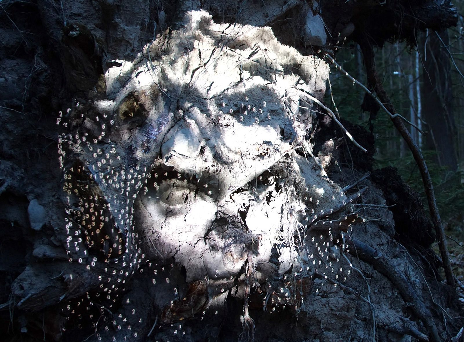 Στα δέντρα, στο χώμα, στις πέτρες – αμέτρητες λέξεις, σύμβολα, φωτεινά μικρο-μόρια “ύλης” αρχίζουν να κινούνται σαν αρχαίες μορφές ζωής που χαράσσουν τις δικές τους διαδρομές. Μυρμήγκια, κάμπιες, μικρά φίδια; Ίσως και στίχοι, χρησμοί, ψυχές ή προσευχές που πήραν σχήμα βγαλμένες από το συλλογικό υποσυνείδητο. Οι λέξεις γίνονται έντονες μέσα στο σκοτάδι – κάτι μαγικό συμβαίνει – το φυσικό τοπίο αρχίζει να χάνεται και εμφανίζεται ένας άλλος κόσμος, ένας γλωσσικός οργανισμός που αναπνέει μέσα στο φως.