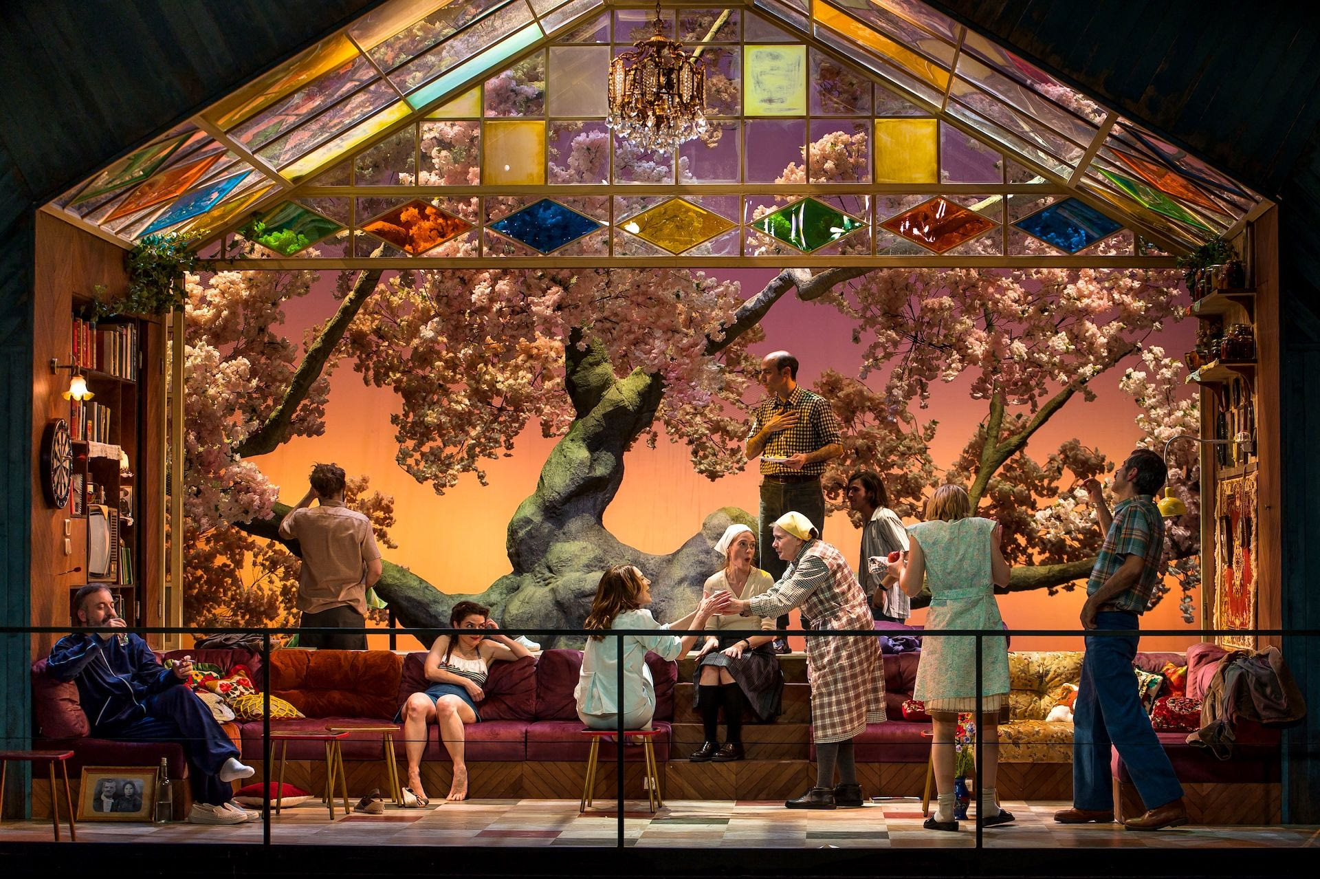 Στο βάθος της σκηνής δεσπόζει ολάνθιστος ο βυσσινόκηπος, ένα σύμβολο ομορφιάς και ευημερίας που αντικατοπτρίζει το πλήγμα που υφίσταται ο κόσμος των ηρώων. Μπροστά του μία τεράστια τζαμαρία ενός βαρυφορτωμένου αστικού σαλονιού με σήμα κατατεθέν μία επιβλητική φλοκάτη αρκούδα.