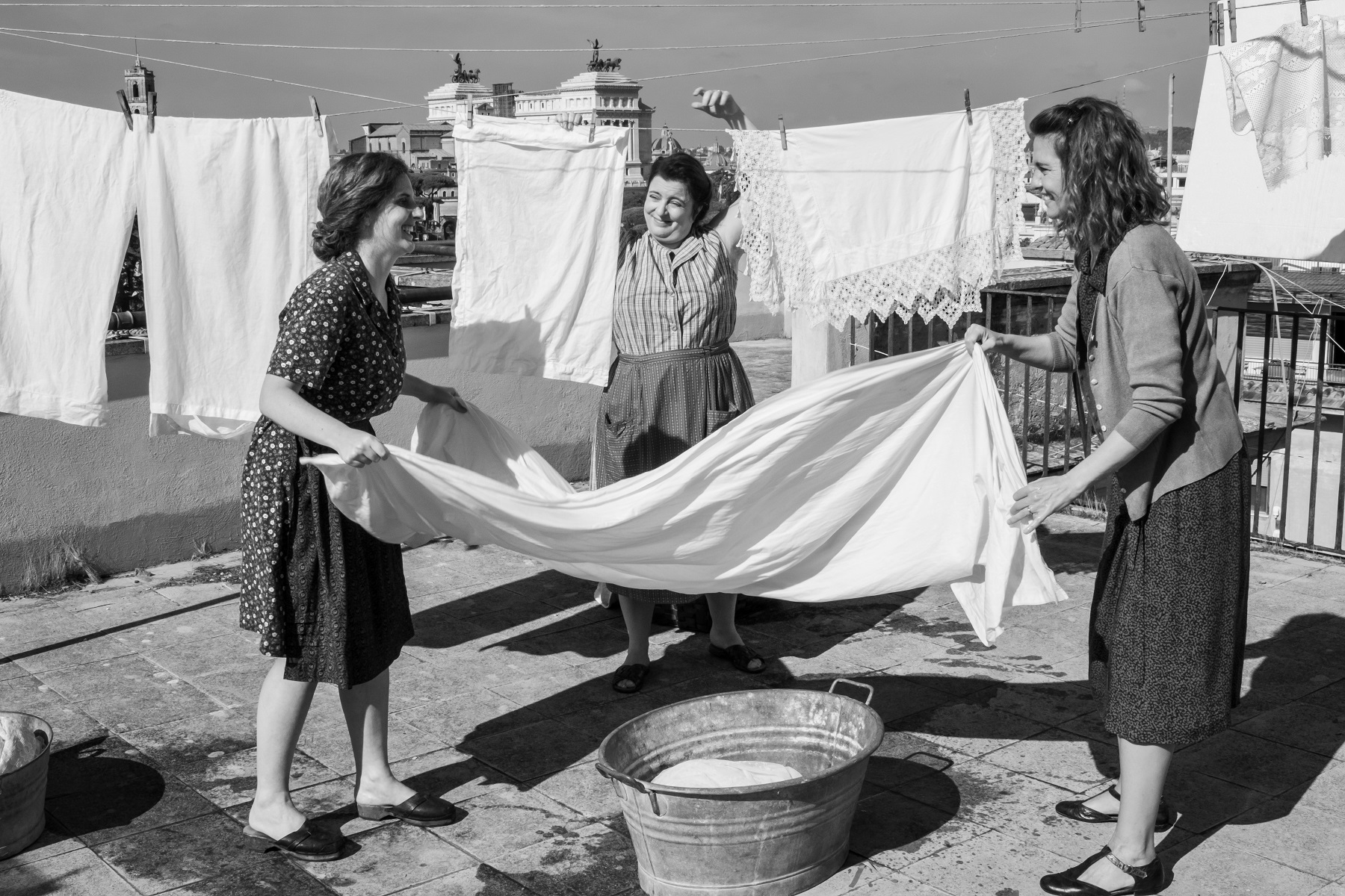 Γυρισμένο σε ασπρόμαυρο και ξεκινώντας με μια μακρά σκηνή που χαρτογραφεί την γειτονιά της Ντέλια με υπομονή και λεπτομέρεια ώστε κάθε σοκάκι να ζωντανεύει, το φιλμ προφανώς αντηχεί τη νεορεαλιστική παράδοση ενός ΝτεΣίκα. Δεν πρόκειται απλώς για άδεια στιλιστική αναφορά, αλλά για δήλωση αφηγηματικής πρόθεσης. Μπορεί στο Πάντα Υπάρχει το Αύριο τα locations να αντικαθίστανται από σκηνικά και η αμεσότητα να φιλτράρεται μέσα από στιλιζάρισμα (θα επανέλθουμε σε αυτό) αλλά η Κορτελέζι ξέρει πολύ καλά γιατί επικαλείται την παράδοση του σινεμά της χώρας της λέγοντας αυτή την ιστορία: δεν ξεχνάει ποτέ την ταξική διάσταση του ζητήματος που διαπραγματεύεται.