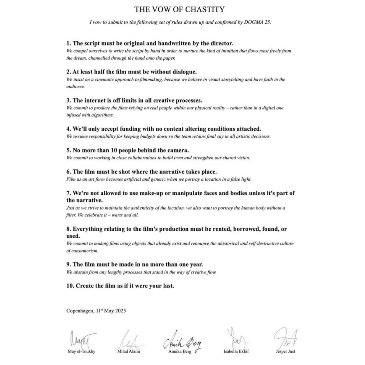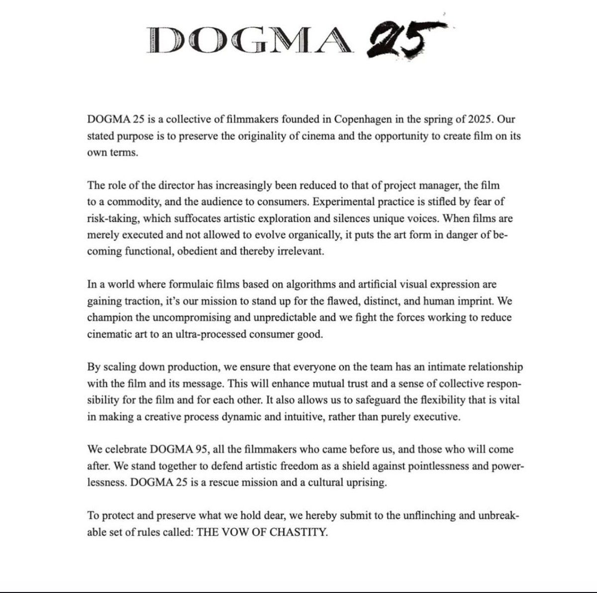 Μια από τις πιο ενδιαφέρουσες ειδήσεις που βγήκαν από τις φετινές Κάννες είναι η ίδρυση ενός νέου Δόγματος από ένα γκρουπ σκανδιναβών δημιουργών που, ακολουθώντας τις διδαχές των Τρίερ και Βίντερμπεργκ μετά το σημαδιακό Δόγμα ‘95, ανακοίνωσαν μια νέα κολεκτίβα, αυτή τη φορά ως αντίδραση στο ίδιο το ίντερνετ.