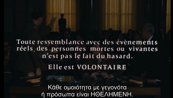 Λίγο πριν πάρει το λόγο ο “Στρατηγός”, ο σκηνοθέτης υπενθυμίζει στους θεατές ότι “κάθε ομοιότητα με πρόσωπα και γεγονόταν είναι ΗΘΕΛΗΜΕΝΗ”