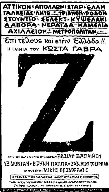 Ακριβώς πριν από 54 χρόνια το “Ζ” έβγαινε στις κινηματογραφικές αίθουσες της Γαλλίας. Η συναρπαστική ταινία του Κώστα Γαβρά, βασισμένη στο ομώνυμο βιβλίο του Βασίλη Βασιλικού, παραμένει το κορυφαίο πολιτικό θρίλερ όλων των εποχών και έχει τη δική του ξεχωριστή ιστορία