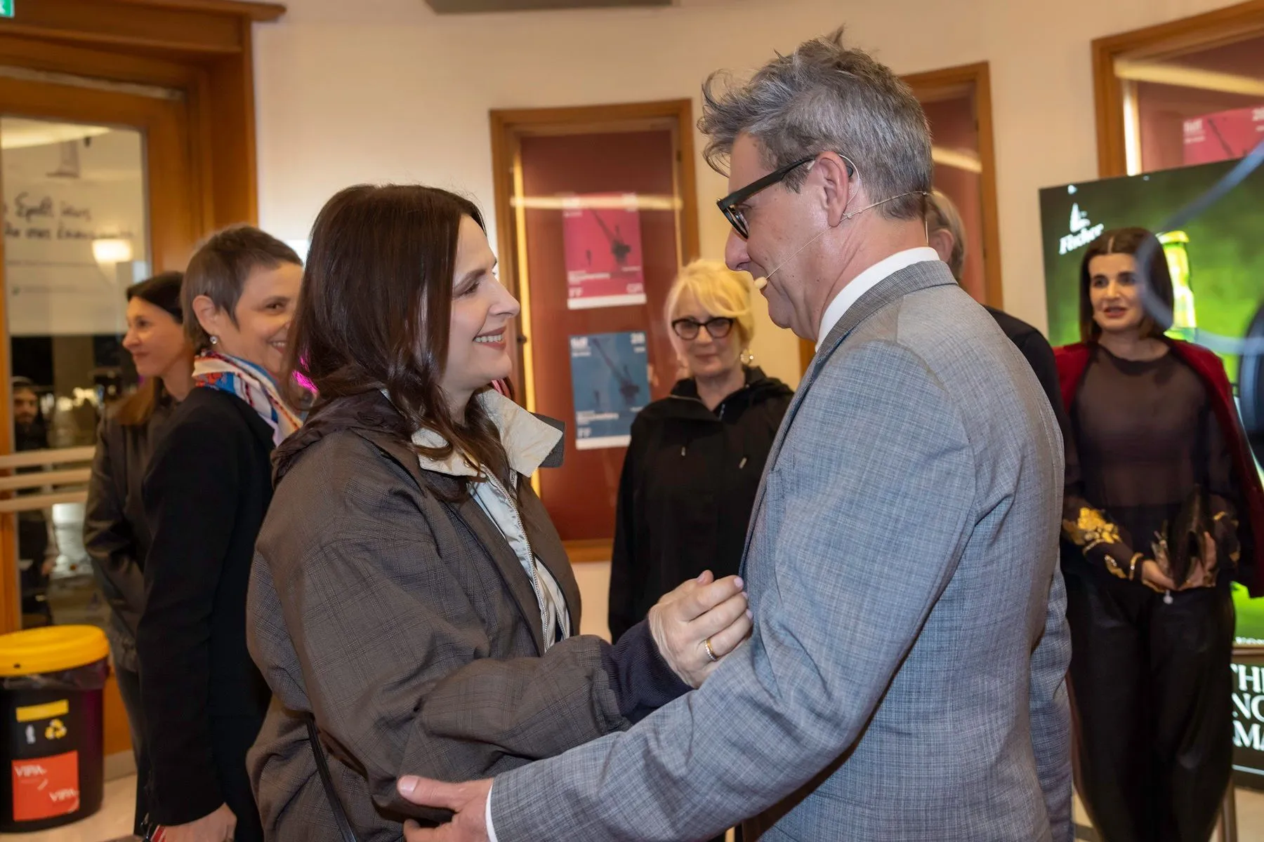 Η Ζιλιέτ Μπινός στο Ολύμπιον με τον καλλιτεχνικό διευθυντή του φεστιβάλ ντοκιμαντέρ Θεσσαλονίκης, Ορέστη Ανδρεαδάκη. Βασίλης Βερβερίδης