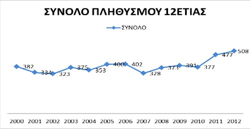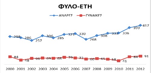 * Το 2012 καταγράφηκαν 508 αυτοκτονίες (417 άντρες και 91 γυναίκες)