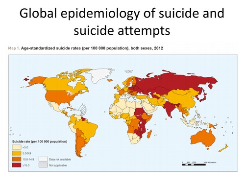Ταυτόχρονα, παρακάτω μπορείτε να δείτε ποια η θέση της Ελλάδας σε σχέση με το δείκτη αυτοκτονιών παγκοσμίως. Η Ελλάδα, παρά τις παρατηρούμενες αυξήσεις του αριθμού των αυτοκτονιών τα τελευταία χρόνια, διατηρεί ακόμη μία από τις χαμηλότερες θέσεις στην Ευρώπη.