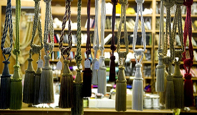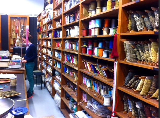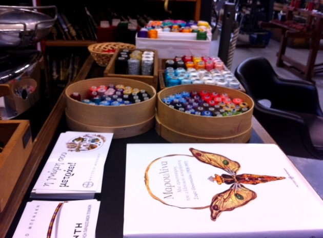 Πλάνα που παραπέμπουν σε ελληνική ασπρόμαυρη ταινία. Ο χώρος δεν ξεπερνά τα 100 τ.μ. Οικείος και φιλόξενος. Μυρίζει έντονα παλιό ύφασμα. Και κάνει λίγο ψύχρα. Στα ράφια και τους τοίχους βλέπεις διακοσμητικά από βαμβάκι, ασήμι, χρυσό και μετάξι. «Δες εδώ. Μπορείς να πάρεις μία γεύση από το τι έφτιαχναν τότε», λέει ο Δημήτρης.
