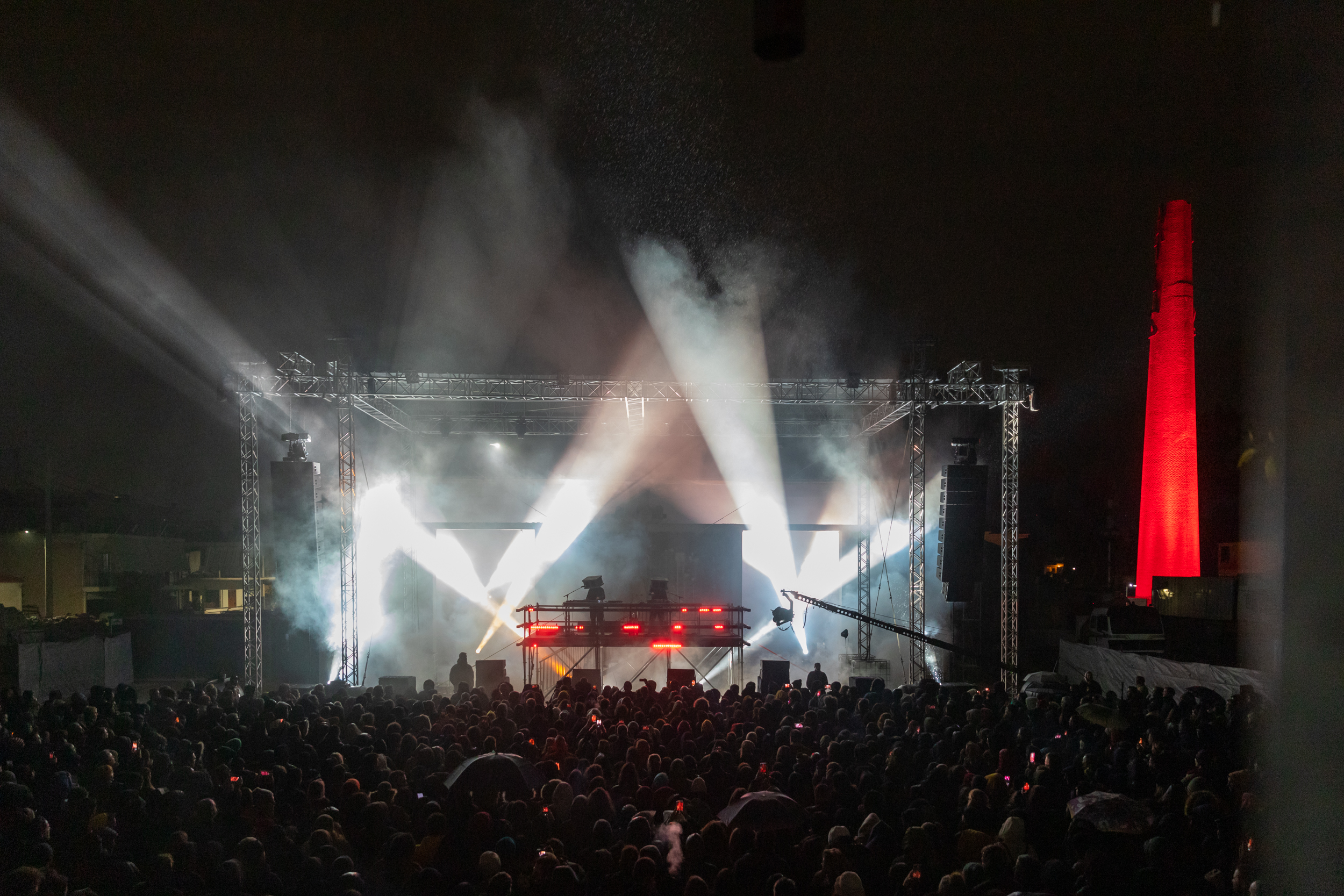 Η συναυλία τελικά δεν έγινε σε κλειστό χώρο -όπως ίσως λανθασμένα είχαμε καταλάβει- αλλά στο προαύλιο. Δύσκολα από άποψη κρύου και βροχής, ιδανικά όμως από άποψη σκηνικού, αφού στο φόντο υψωνόταν το εμβληματικό φουγάρο του ΙΡΙΣ, φωταγωγημένο από την Ελευθερία Ντεκώ ειδικά για την περίσταση (θυμίζουμε ότι έχει κερδίσει Emmy για τη δουλειά της στην τελετή έναρξης των Ολυμπιακών Αγώνων Αθήνα 2004, και θεωρείται ειδήμων του θεατρικού φωτισμού).