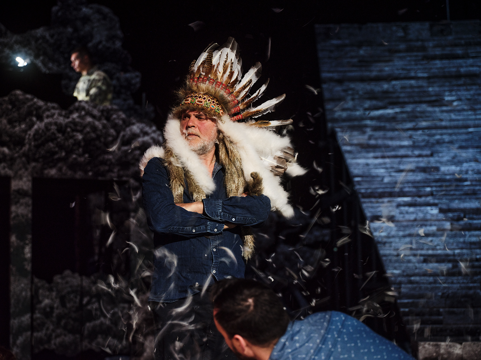 Ο Θανάσης Αλευράς στον ρόλο του ενδυματολόγου δε δέχεται συγχαρητήρια και αντεπιστρέφει τα καλά λόγια στους ηθοποιούς, η Έμιλυ Κολιανδρή με περισσή ευγένεια εκφράζει την υφέρπουσα ανασφάλεια που νιώθει για τη νεότερή της ηθοποιό, την απαστράπτουσα Ζέτα Μακρυπούλια που “τόλμησε” να αποσπάσει ένα παραπάνω χειροκρότημα, ενώ ο Χρήστος Λούλης επιζητεί επιβεβαίωση από την καλλιτεχνική διευθύντρια του φεστιβάλ, Γαλήνη Χατζηπασχάλη. Κι ενώ ο Γιάννης Κότσιφας αποφασίζει να κρεμαστεί (κυριολεκτικά) γιατί η παράσταση κράτησε μισή ώρα παραπάνω και κουράστηκε, οι ηθοποιοί κουβαλούν μέσα στη σκηνή τραπέζια από την ταβέρνα του Λυγουριού, τα στήνουν ατάκτως και εκεί εκθέτουν όλη τη συναισθηματική και ανθρωποφαγική τους βουλιμία φλυαρώντας ακατάπαυστα και ζητώντας την ίδια στιγμή απεγνωσμένα έναν μουσακά από την… ταβερνιάρισσα Χαρούλα Αλεξίου. Και ο κρεμασμένος Γιάννης Κότσιφας εκεί. Σαν τον ελέφαντα μέσα στο δωμάτιο. Με τη Ζέτα Μακρυπούλια να τον παρατηρεί και να φρίττει και τους υπόλοιπους να την προτρέπουν να κοιτάξει αλλού και να τον αγνοήσει. Και σαν επίλογος, ο Νίκος Καραθάνος, που ντυμένος ινδιάνος “ξεφυτρώνει” στο κοίλον ξαφνικά και πυροβολεί αδιακρίτως όποιον βρει μπροστά του.