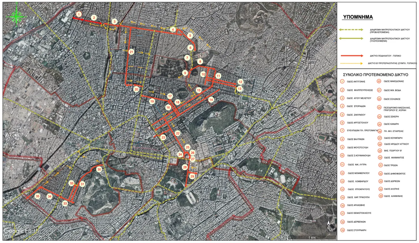 Όπως φαίνεται από τον χάρτη που περιλαμβάνει το προτεινόμενο δίκτυο, οι ποδηλατόδρομοι θα περνούν από οδούς: στα Σεπόλια (Οδός Αντιγόνης, Φιλιππουπόλεως, Αγίου Μελετίου), στην Κυψέλη (Σποράδων, Ζακύνθου, Αργοστολίου, Ευελπίδων), στο Γκύζι ( Βαλτινών, Μουστοξύδι, Κουμανούδη, Λύτρα, Μομφεράτου, Λομβάρδου), στα Εξάρχεια (Ιπποκράτους, Χαρ. Τρικούπη, Αραχώβης, Θεμιστοκλέους, Δερβενίων, Στουρνάρη), κοντά στη Βικτώρια (Μακεδονίας, Μιχ. Βόδα), στο στο κέντρο της πρωτεύουσας, (Σόλωνος, Πεζόδρομος Μασσαλίας, Σέκερη, Κανάρη, Πλ. Φιλικής Εταιρείας, Κουμπάρη, Ηρώδου Αττικού, Βασ. Γεωργίου Β’) και στα Πετράλωνα (Ακαμάντος, Τρωών, Δημοδώντος, Δωριέων, Αλώπης, Αλκμήνης).