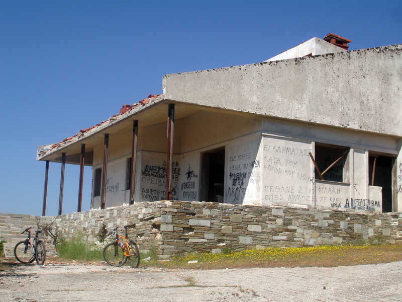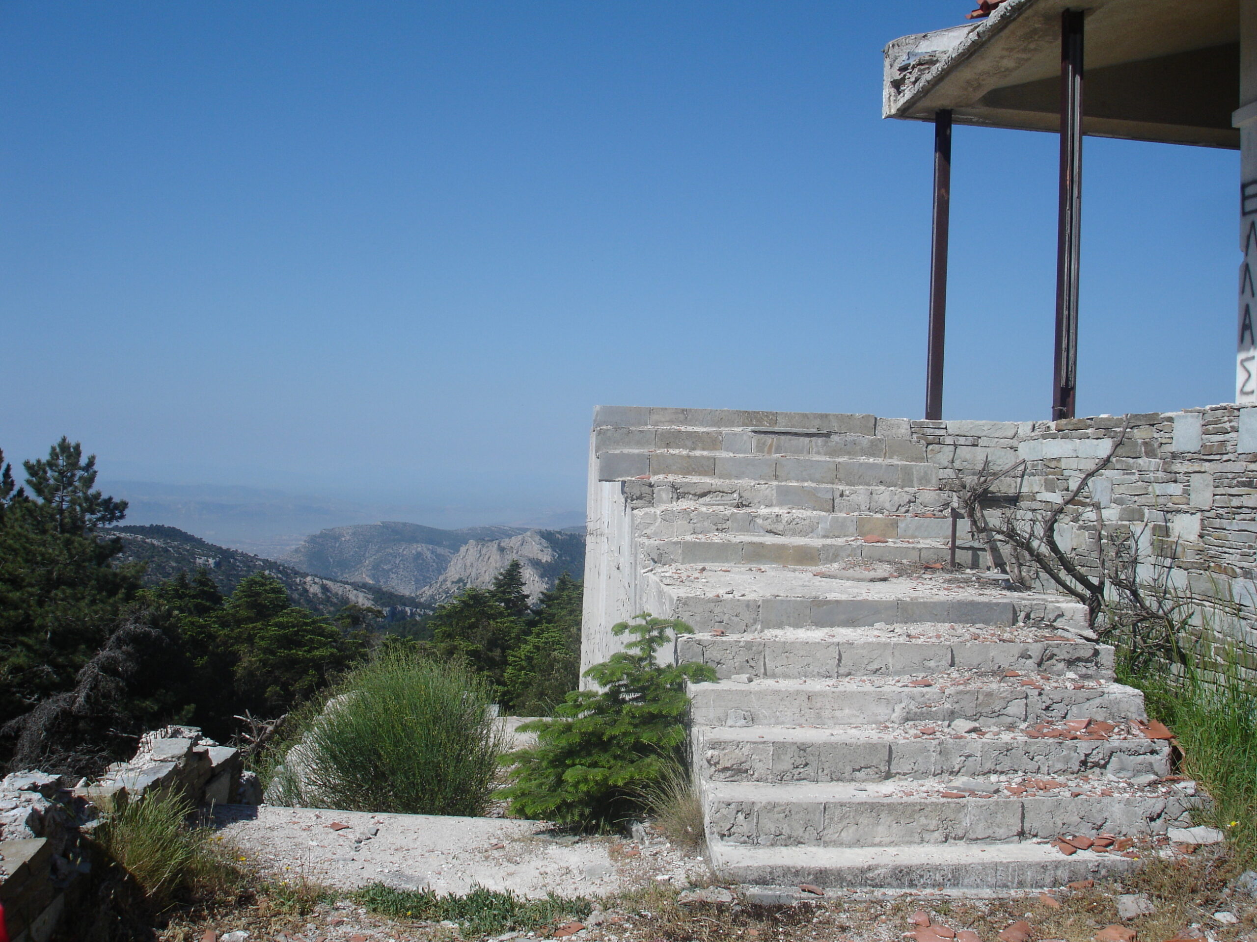 Μέχρι πριν από λίγα χρόνια μπορούσε κανείς να δει τις τεράστιες κεραίες στην κορυφή του βουνού. Σήμερα, όποιος οδηγήσει στο δρόμο μετά τη μονή Αγίου Παντελεήμονα και φτάσει στις πρώην εγκαταστάσεις του σταθμού στρατιωτικών τηλεπικοινωνιών που λειτούργησε περίπου μέχρι τα τέλη τις δεκαετίας του ’90, μπορεί να αναγνωρίσει στα λεηλατημένα κτίρια πού βρίσκονταν οι χώροι του προσωπικού, ο όρχος των οχημάτων, οι γεννήτριες, ο χώρος συγκέντρωσης κ.λπ. Επισήμως ο χώρος αποτελεί ακόμα απαγορευμένη περιοχή (γίνονται επισκέψεις από περιπολικά, κυρίως επειδή σε παρακείμενο χώρο βρίσκονται οι πομποί της ΕΕΤΤ) αλλά πολλοί είναι εκείνοι που μπαίνουν στη βάση για εξερεύνηση και για να θαυμάσουν τη θέα. Παρόμοιες εγκαταστάσεις σε εγκατάλειψη, αλλά με απολύτως ελεύθερη είσοδο, βρίσκονται στην κορυφή του Κιθαιρώνα, στο Κερατοβούνι στην Κερατέα, στη Λευκάδα πάνω από την Εγκλουβή κ.α.
